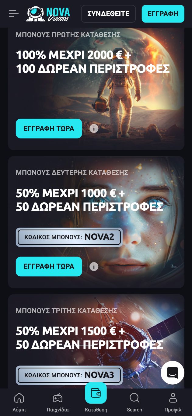 To πακέτο καλωσορίσματος στο NovaDreams casino είναι υπερπλούσιο! Στους νέους παίκτες, η πλατφόρμα δίνει μπόνους έως 6.000€ και 300 δωρεάν περιστροφές! Το μπόνους προσφέρεται στις πρώτες τέσσερις καταθέσεις που θα κάνουν οι καινούργιοι χρήστες.