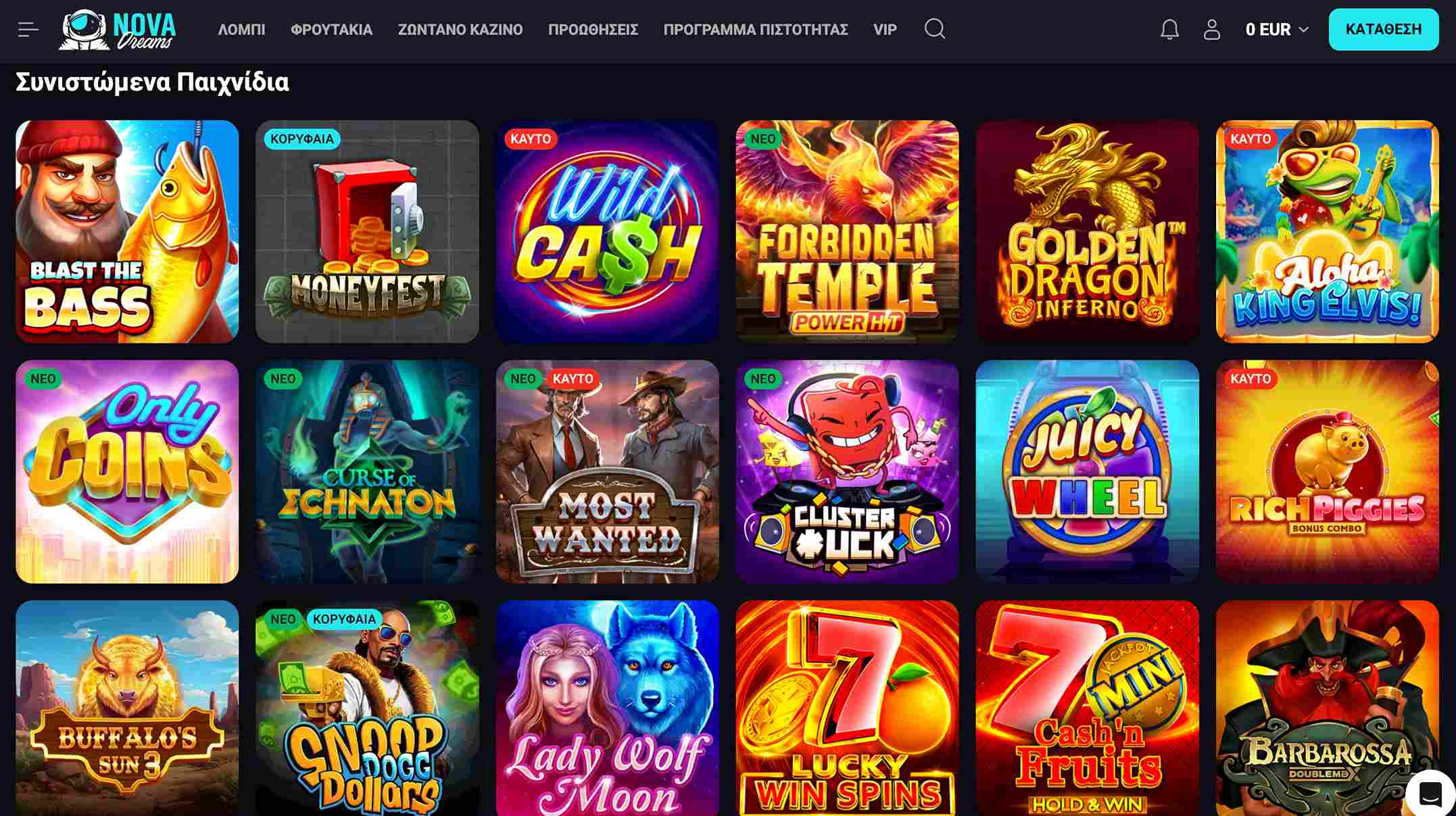 Στο ΝοvaDreams καζίνο βρείτε χιλιάδες τίτλους παιχνιδιών, με μεγάλο μέρος αυτών να προέρχονται από τους μεγαλύτερους δημιουργούς και τους πιο αξιόπιστους παρόχους. Περισσότερα από 5.000 φρουτάκια και συνολικά 5.500+ παιχνίδια (μαζί με τα table games και τα live τραπέζια) είναι διαθέσιμα στην πλατφόρμα και περιμένουν να τα εξερευνήσετε.