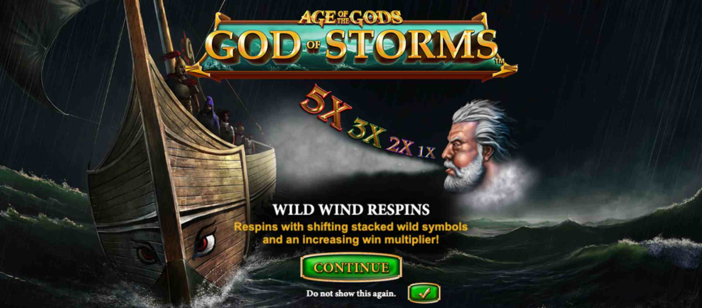 Σε περίπτωση που ενεργοποιηθεί ο μηχανισμός wild wind respins τότε ο «θεός των καταιγίδων» θα φυσάει έναν πλήρη wild τροχό αριστερά ή δεξιά αυξάνοντας τον πολλαπλασιαστή κατά 1x (max 5x) μέχρι αυτός να εξέλθει του ταμπλό είτε από αριστερά είτε από δεξιά. Η μέγιστη νίκη είναι 2,500x, το RTP 96,14% και το ποντάρισμα είναι από 0,01€ έως και 10€ ανά ενεργή γραμμή πληρωμής δηλαδή μπορείτε να ποντάρετε έως και 250€. Προσφέρονται και 4 προοδευτικά τζακποτ!
