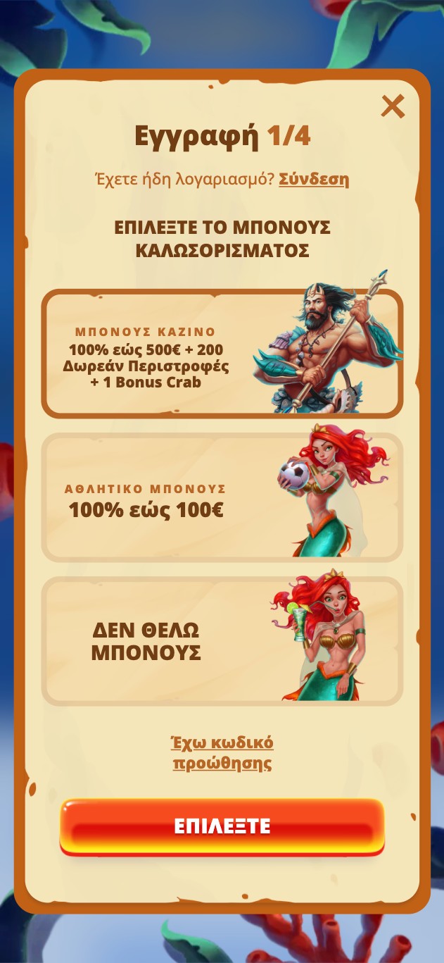 Συγκεκριμένα αν εγγραφείτε θα λάβετε 100% μπόνους έως και 500€ επί της κατάθεσης σας, 200 δωρεάν περιστροφές και 1 ευκαιρία στο bonus crab (mini-game).