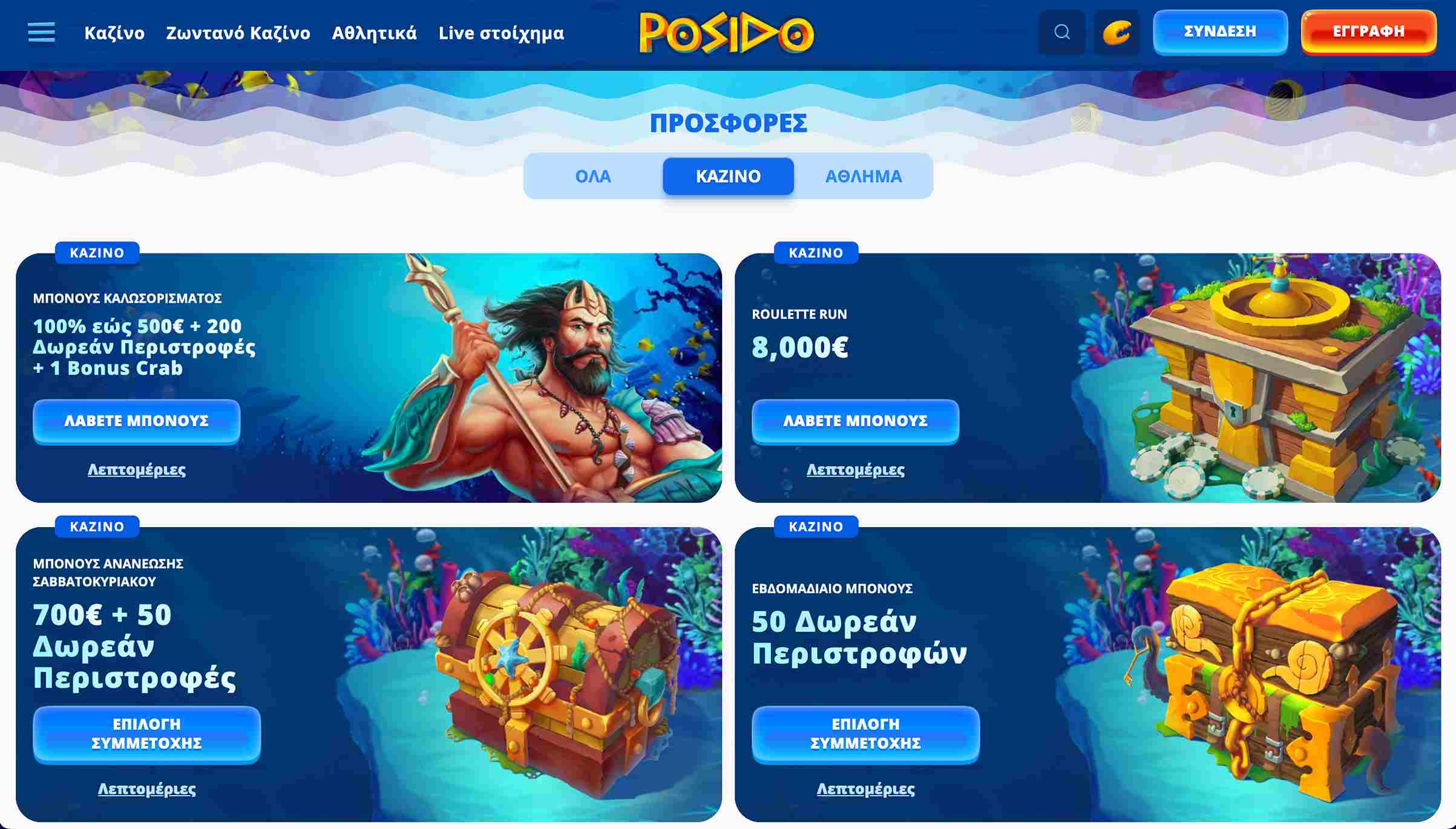 Όπως και στα περισσότερα online casino, έτσι και στη Posido οι προσφορές παίζουν πολύ σημαντικό ρόλο σε βαθμό που πολλές φορές οι παίκτες θα κρίνουν αν θα κάνουν κατάθεση μόνο και μόνο για αυτό. Κατανοώντας τις ανάγκες της αγοράς, η πλατφόρμα ανταμείβει τους νέους παίκτες στο καζίνο της με ένα εκπληκτικό μπόνους καλωσορίσματος.
