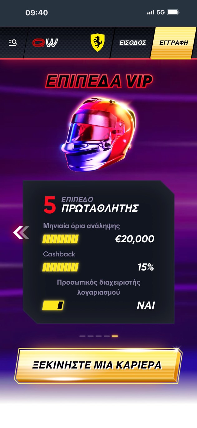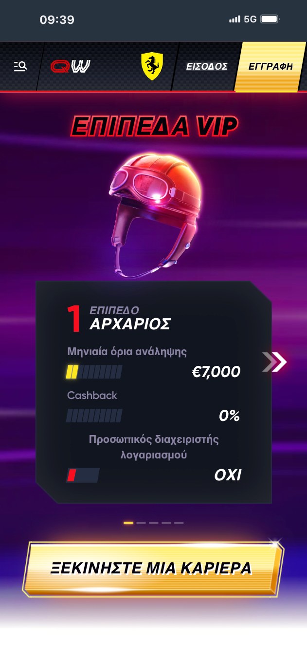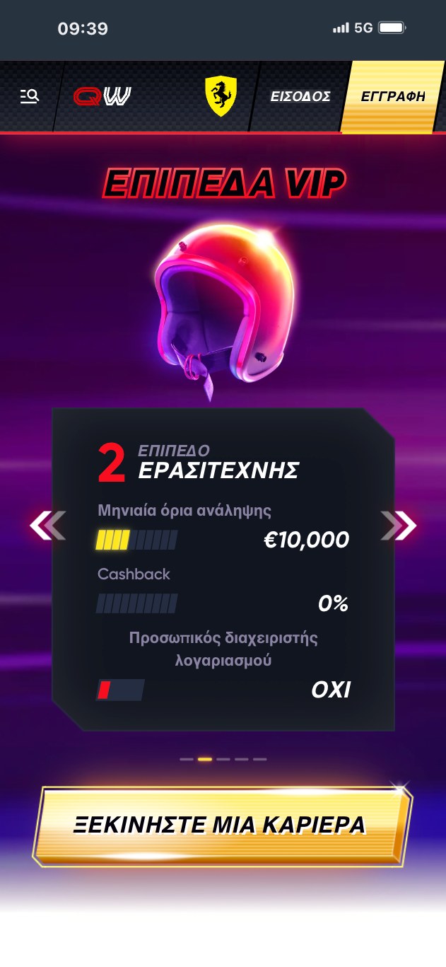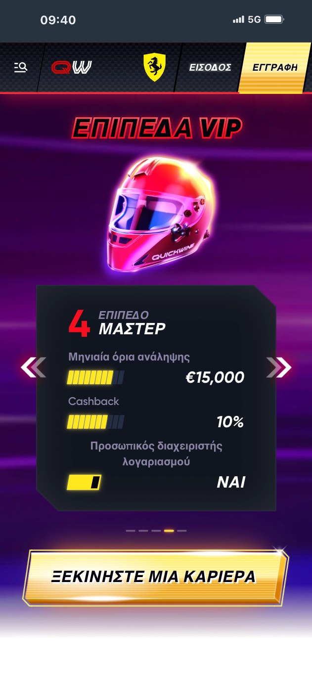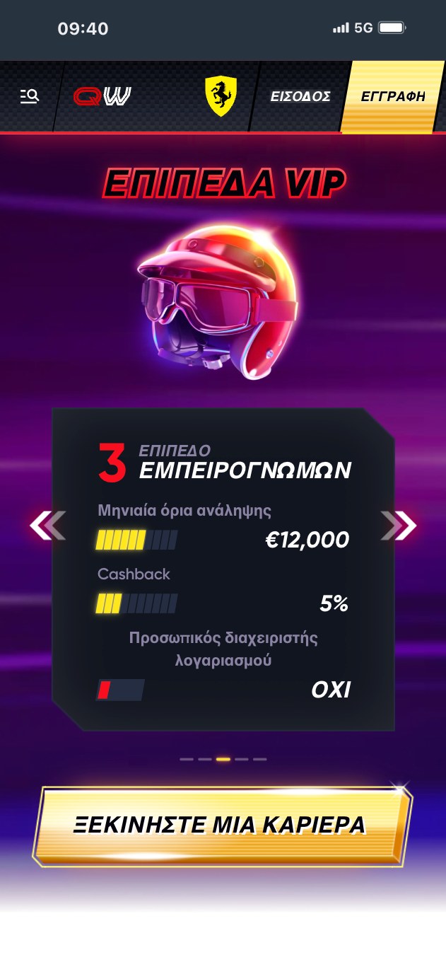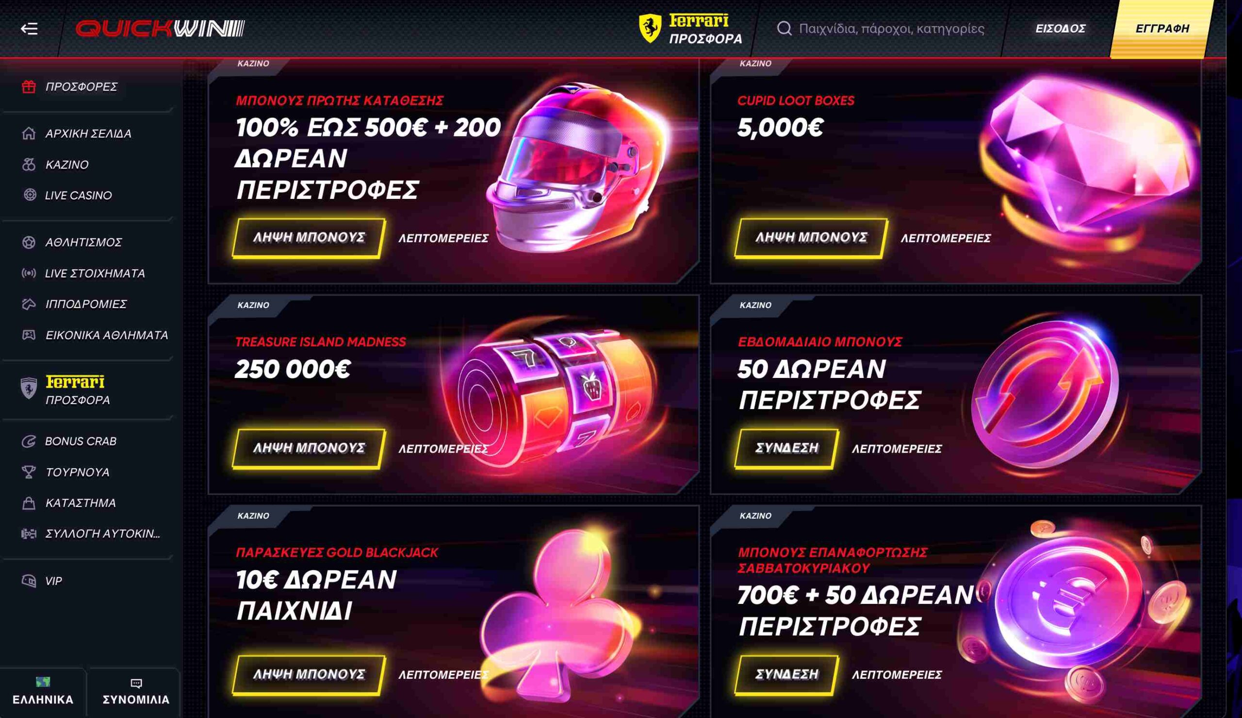 Και εκτός από το ότι κερδίζετε πόντους, όσο περισσότερο παίζετε, τόσο περισσότερα προνόμια έχετε. Βάσει του προγράμματος επιβράβευσης του QuickWin, ξεκινάτε από το βασικό επίπεδο 1 και μπορείτε να φτάσετε ως και το επίπεδο 5, απολαμβάνοντας πολλά πλεονεκτήματα, προσφορές αλλά και έξτρα υπηρεσίες όπως μεγαλύτερες αναλήψεις, προσωπικό διαχειριστή λογαριασμού, μεγαλύτερο cashback αλλά και VIP μπόνους!
