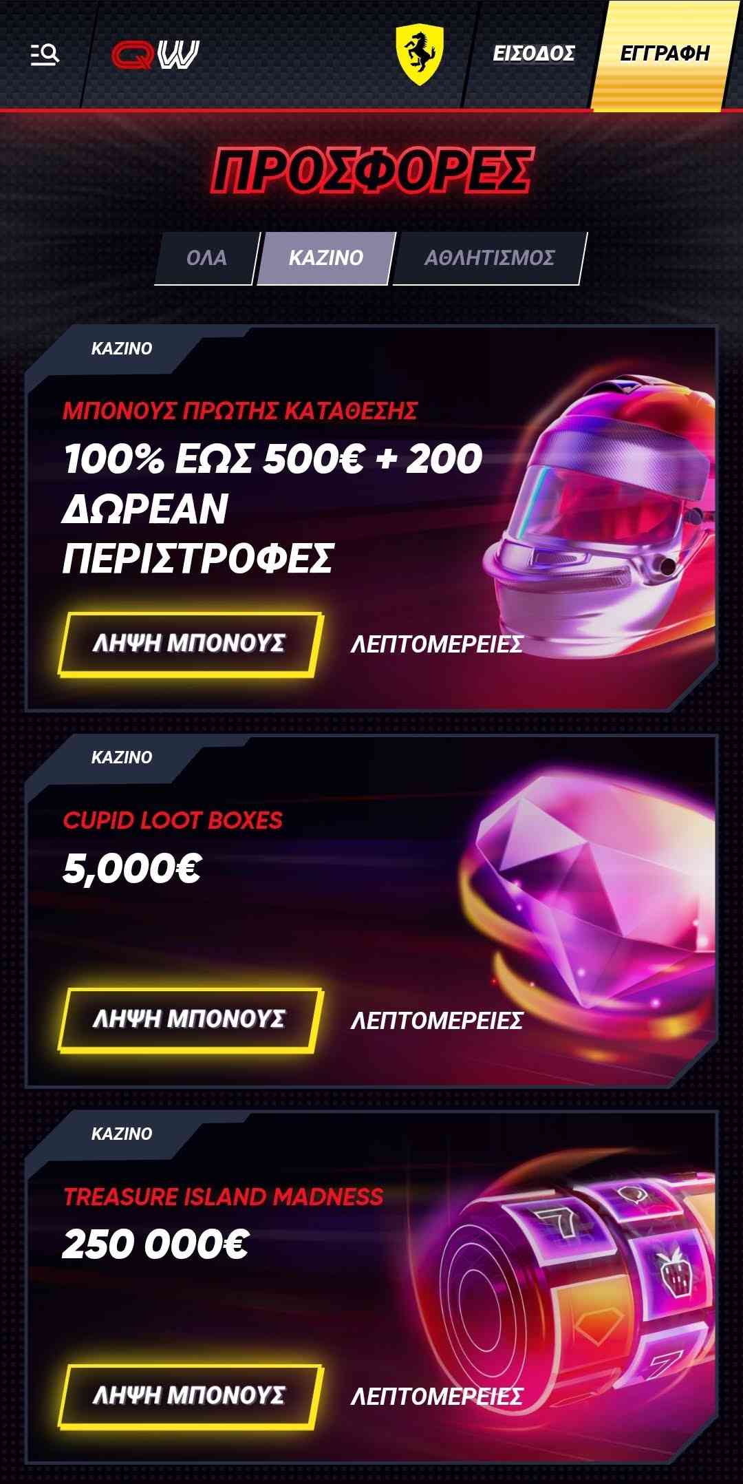 Δεν είναι όμως μόνο το μπόνους εγγραφής δελεαστικό. Είναι και οι υπόλοιπες προσφορές που θα βρείτε στο καζίνο, όπως βλέπετε στον παρακάτω πίνακα. Από reload μπόνους και cashback έως δωρεάν περιστροφές, δωρεάν παιχνίδι και τουρνουά με μεγάλα έπαθλα.