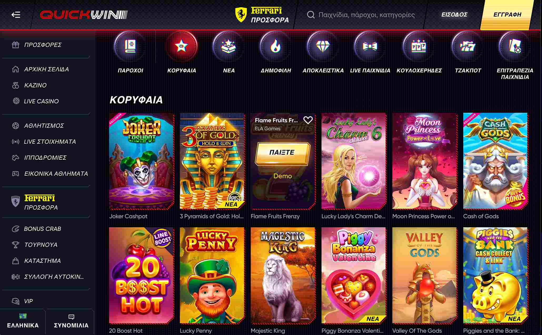 🎰 Κουλοχέρηδες: χιλιάδες διαφορετικά φρουτάκια με υψηλό RTP και πολλές παραλλαγές σας περιμένουν στο καζίνο QuickWin. Έχετε την ευκαιρία να βρείτε ό,τι σας ταιριάζει, ανάμεσα από κορυφαίους τίτλους κορυφαίων δημιουργών. Κάποια από τα δημοφιλέστερα φρουτάκια που μπορείτε να παίξετε περιλαμβάνουν: