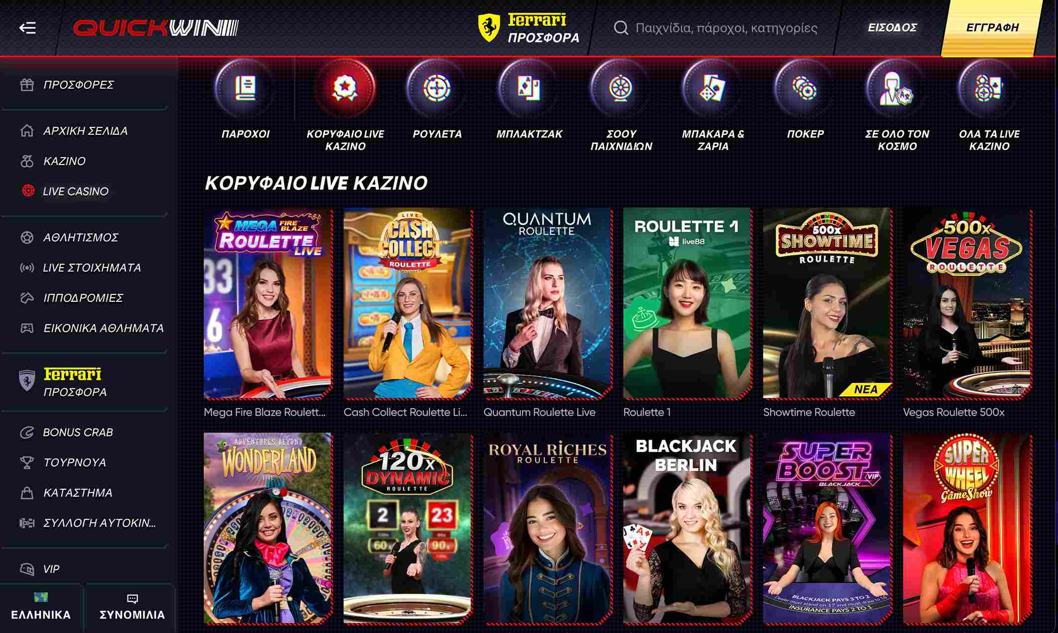 👨💼 Live παιχνίδια: και δεν είναι μόνο τα φρουτάκια και τα παιχνίδια καζίνο σε βίντεο mode, αλλά και τα ζωντανά παιχνίδια που κάνουν τη διαφορά στο QuickWin. Θα βρείτε μια τεράστια συλλογή από live τραπέζια ρουλέτας, πόκερ, blackjack, μπακαρά και ζάρια αλλά και πολλά shows παιχνιδιών για να διασκεδάσετε αλλά και να διεκδικήσετε κέρδη με πραγματικά χρήματα.
