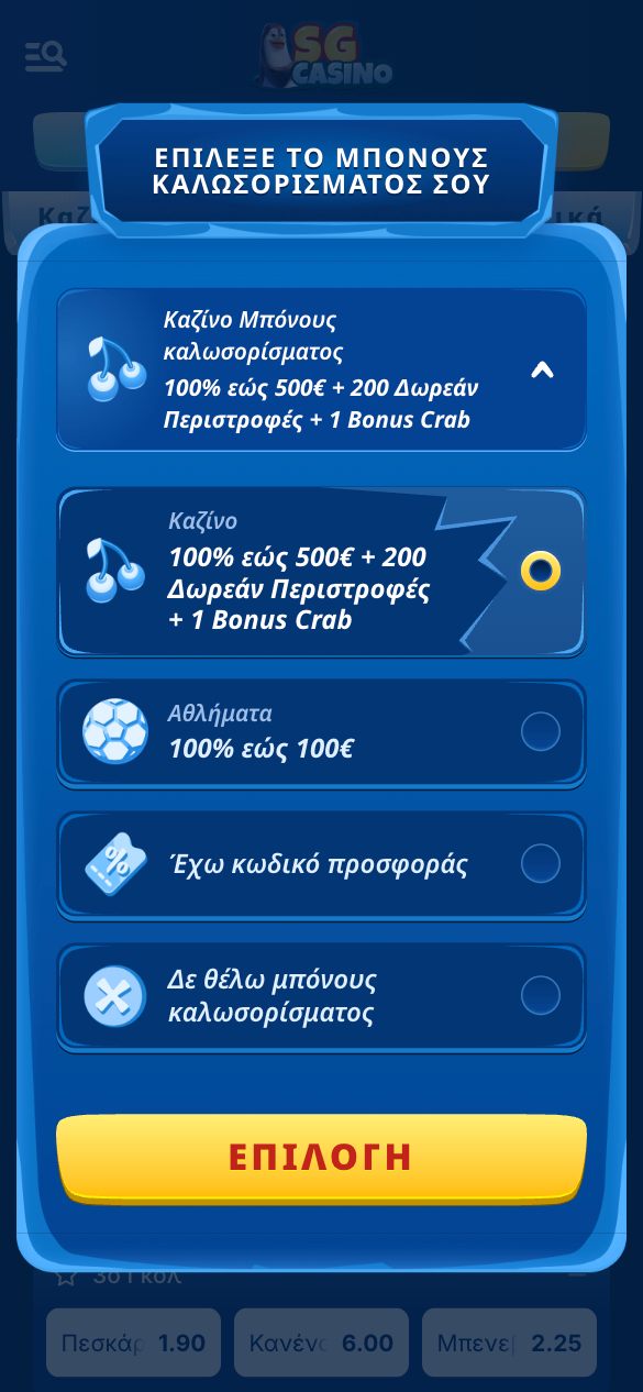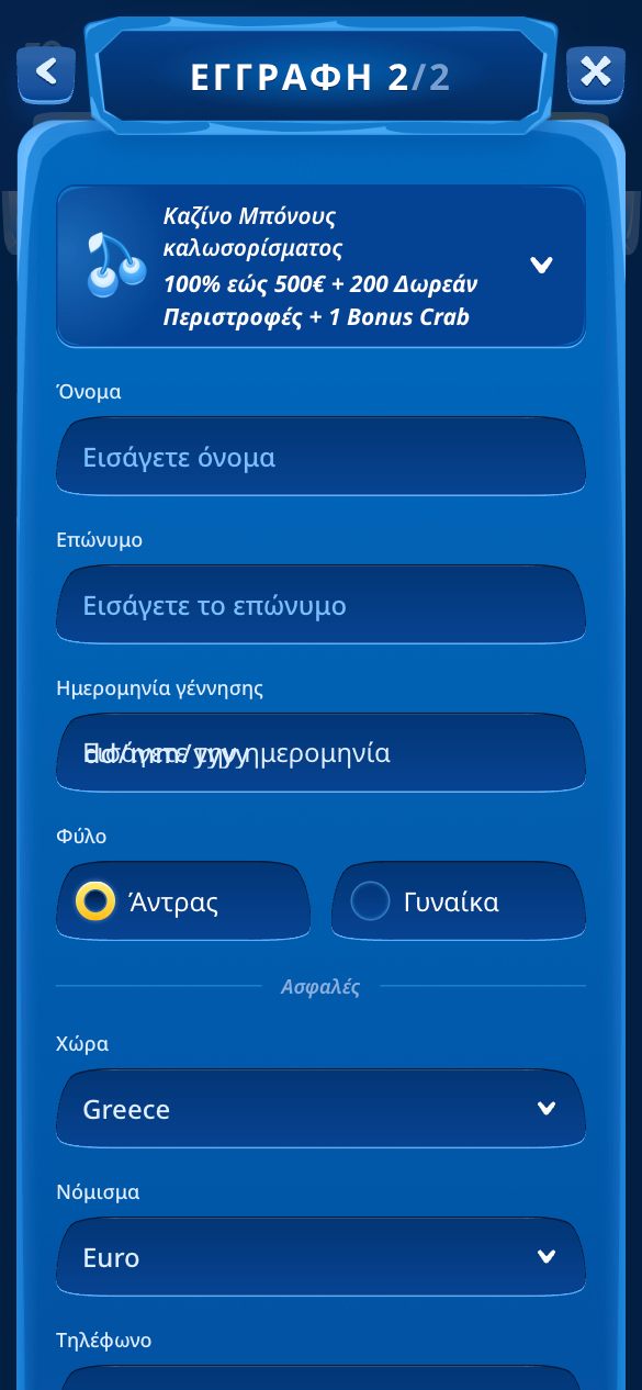 - Καταχωρείτε τα στοιχεία σας (όνομα, επίθετο, ημερομηνία γέννησης, φύλο, στοιχεία επικοινωνίας) και δημιουργείτε τον λογαριασμό σας στο SG Casino.