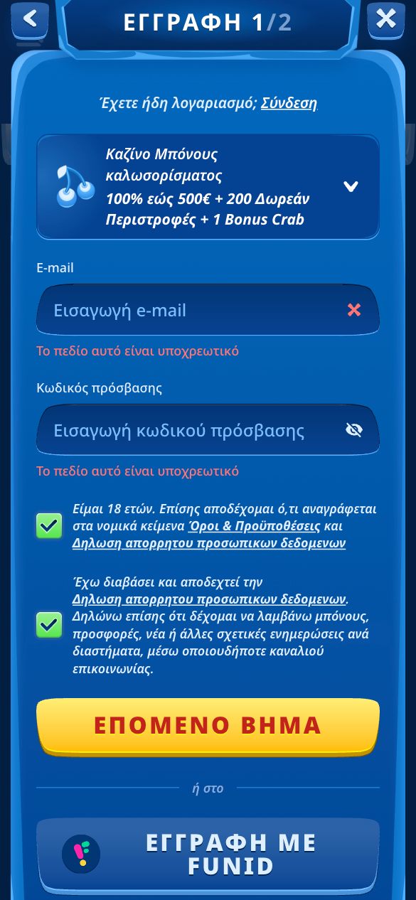 Κάθε νέα εγγραφή στο καζίνο δίνει στον παίκτη ένα μπόνους καλωσορίσματος 100% έως και 500 ευρώ, 200 δωρεάν περιστροφές αλλά και 1 bonus crab. Με την πρώτη κατάθεση στο νέο λογαριασμό – που δεν πρέπει να είναι μικρότερη από 20 ευρώ – θα διπλασιάσετε το ποσό σας και θα πάρετε έξτρα δώρο free spins και bonus crab. Για να ενεργοποιήσετε το μπόνους, υπάρχουν οι εξής προϋποθέσεις: