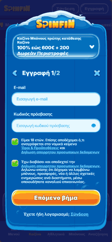 Η δημιουργία λογαριασμού στο Spinfin Casino είναι αρκετά απλή και γρήγορη, αφού αρχικά απαιτείται μόνο ένα email και κωδικός πρόσβασης.