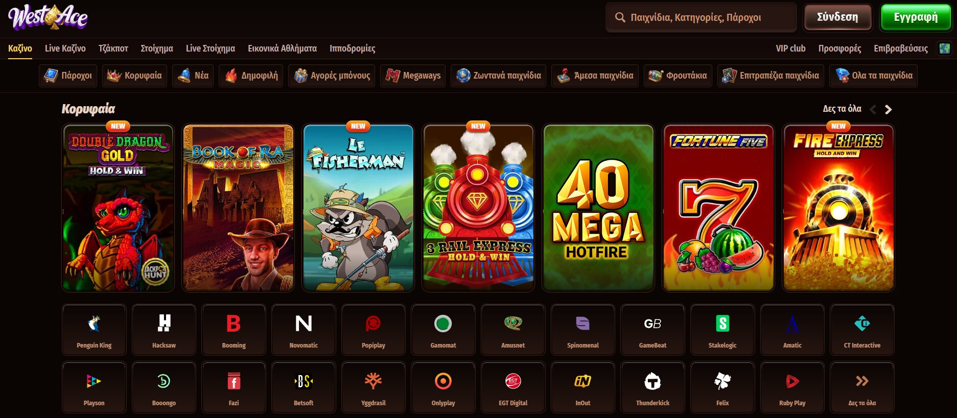 Το WestAce Casino διαθέτει περισσότερα από 9.000 παιχνίδια από 90+ παρόχους, διαμορφώνοντας μια εξαιρετικά πλούσια βιβλιοθήκη τίτλων. Στην πλατφόρμα θα βρείτε μερικά από τα πλέον αναγνωρισμένα studio της αγοράς, όπως Yggdrasil, Novomatic, Hacksaw Gaming, Amusnet, Amatic, Red Tiger, BGaming, Spinomenal και Playson, μεταξύ πολλών ακόμη.