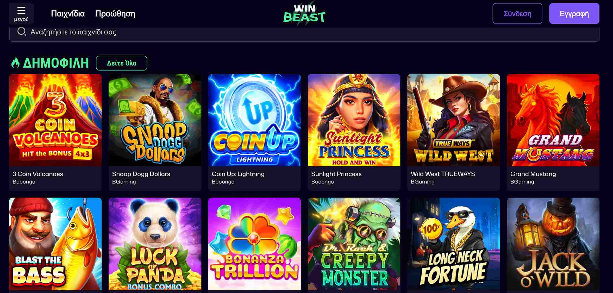 Το WinBeast Casino υιοθετεί έναν σύγχρονο, μινιμαλιστικό σχεδιασμό, με σκούρο μπλε φόντο και πράσινες λεπτομέρειες. Αν εξαιρέσετε το slider με τις προσφορές, η σελίδα δεν «ζαλίζει» με περιττά animations και εφέ.
