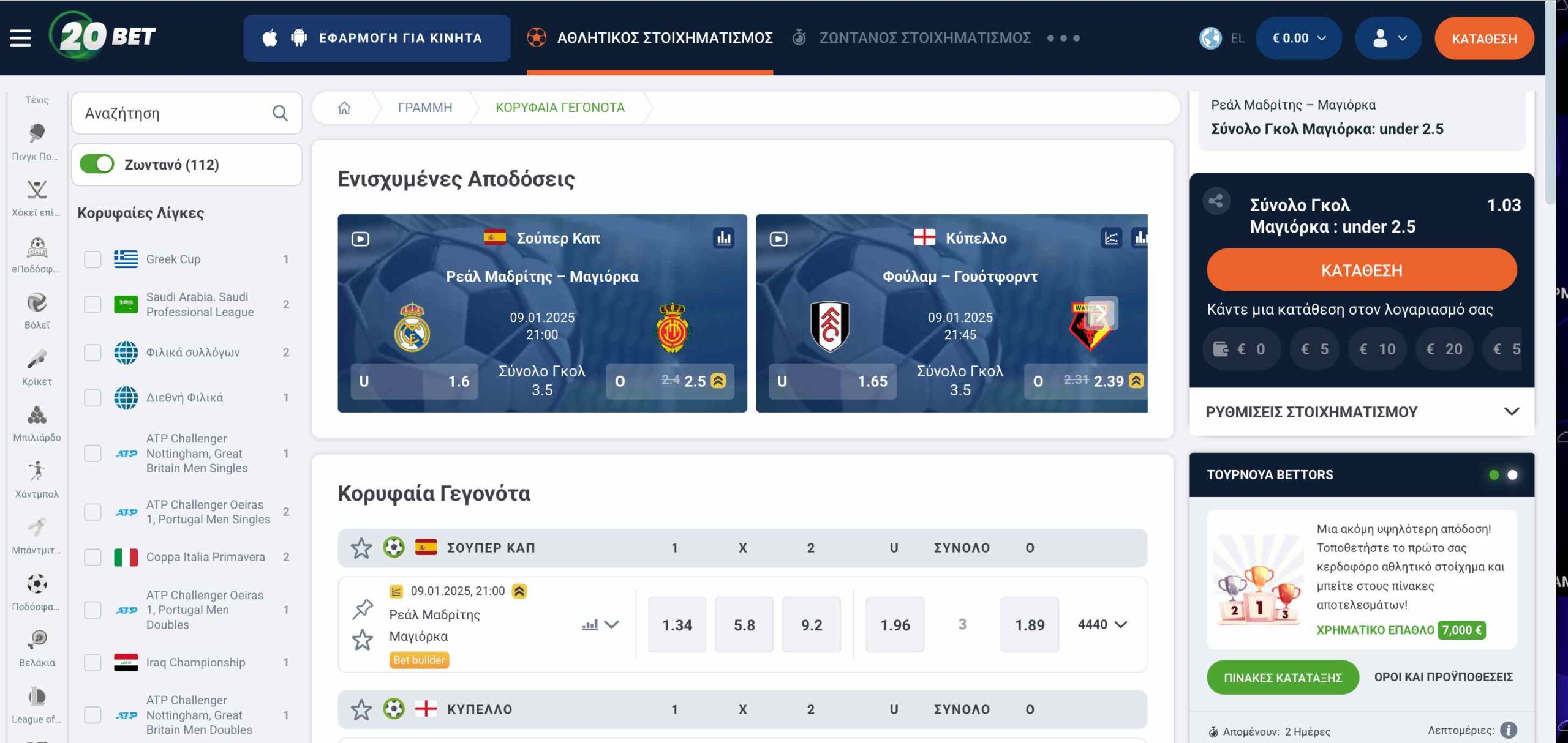 Ο σχεδιασμός είναι στα ατού της 20Bet και αυτό γιατί από τη μια μιλάμε για ένα απλό και λιτό σάιτ – που όμως σε καμία περίπτωση δε θυμίζει “φτωχό” ιστότοπο – και από την άλλη έχει όλα όσα χρειάζεται ένας παίκτης – ευκολία, ταχύτητα, προσβασιμότητα και λειτουργικότητα. Στα αριστερά θα βρείτε το μενού με όλα τα δημοφιλή πρωταθλήματα και στη συνέχεια τη λίστα με όλα τα διαθέσιμα σπορ.