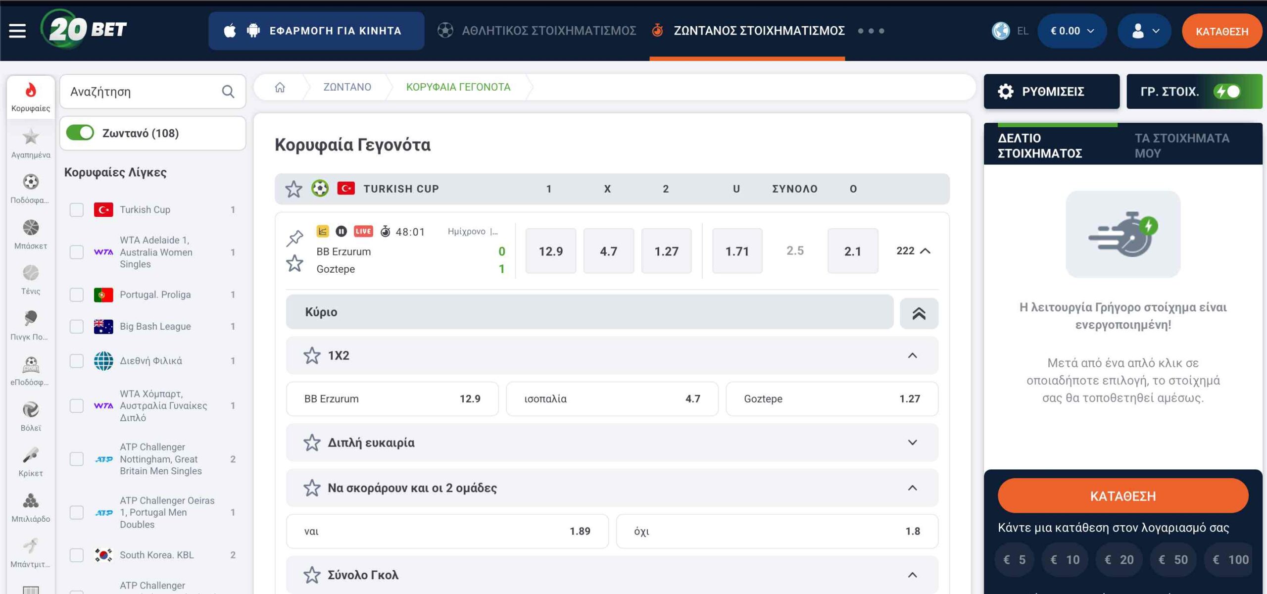 Μπορείτε να επιλέξετε το γεγονός που σας ενδιαφέρει και αυτόματα στο κέντρο της σελίδας εμφανίζονται όλες οι διαθέσιμες αγορές. Από εκεί και πέρα, διαλέγετε την αγορά, τοποθετείτε το στοίχημα και όλες οι λεπτομέρειες εμφανίζονται στα δεξιά της σελίδας, στο δελτίο στοιχήματος. Υπάρχει και η δυνατότητα για “γρήγορο στοίχημα” που απλοποιεί τη διαδικασία και σας γλιτώνει χρόνο και κόπο.