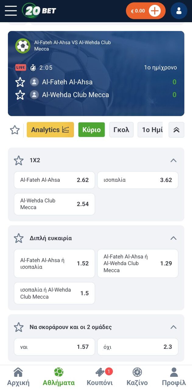 Το ζωντανό στοίχημα στην 20Bet είναι πολύ δυνατό από άποψη αθλημάτων και αγορών, αλλά και από άποψη εξτρά υπηρεσιών που απογειώνουν την εμπειρία σας. Στην ιστοσελίδα θα βρείτε live streaming σε πάρα πολλά γεγονότα – όχι σε όλα όμως – αλλά και ένα εξαιρετικό εργαλείο με αναλυτικά στατιστικά για να σας βοηθήσουν να κάνετε τις κατάλληλες επιλογές στα πονταρίσματά σας.