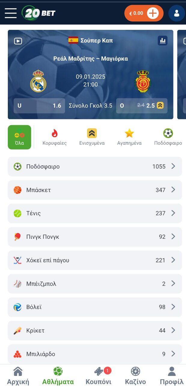Μια μεγάλη γκάμα από σπορ είναι διαθέσιμα στην 20bet, για τους λάτρεις τoυ αθλητικού στοιχήματος. Συνολικά θα βρείτε πάνω από 40.000 γεγονότα σε περισσότερα από 30 αθλήματα, συμπεριλαμβανομένων των eSports, που έχουν την τιμητική τους στην πλατφόρμα. Φυσικά, το ποδόσφαιρο εξακολουθεί να είναι το κορυφαίο σπορ με όλα τα γεγονότα σε διασυλλογικό επίπεδο (όπως Τσαμπιονς Λιγκ και Παγκόσμιο Κύπελλο Συλλόγων) αλλά και σε τοπικό επίπεδο να συγκεντρώνουν το μεγαλύτερο μερίδιο στις αγορές.