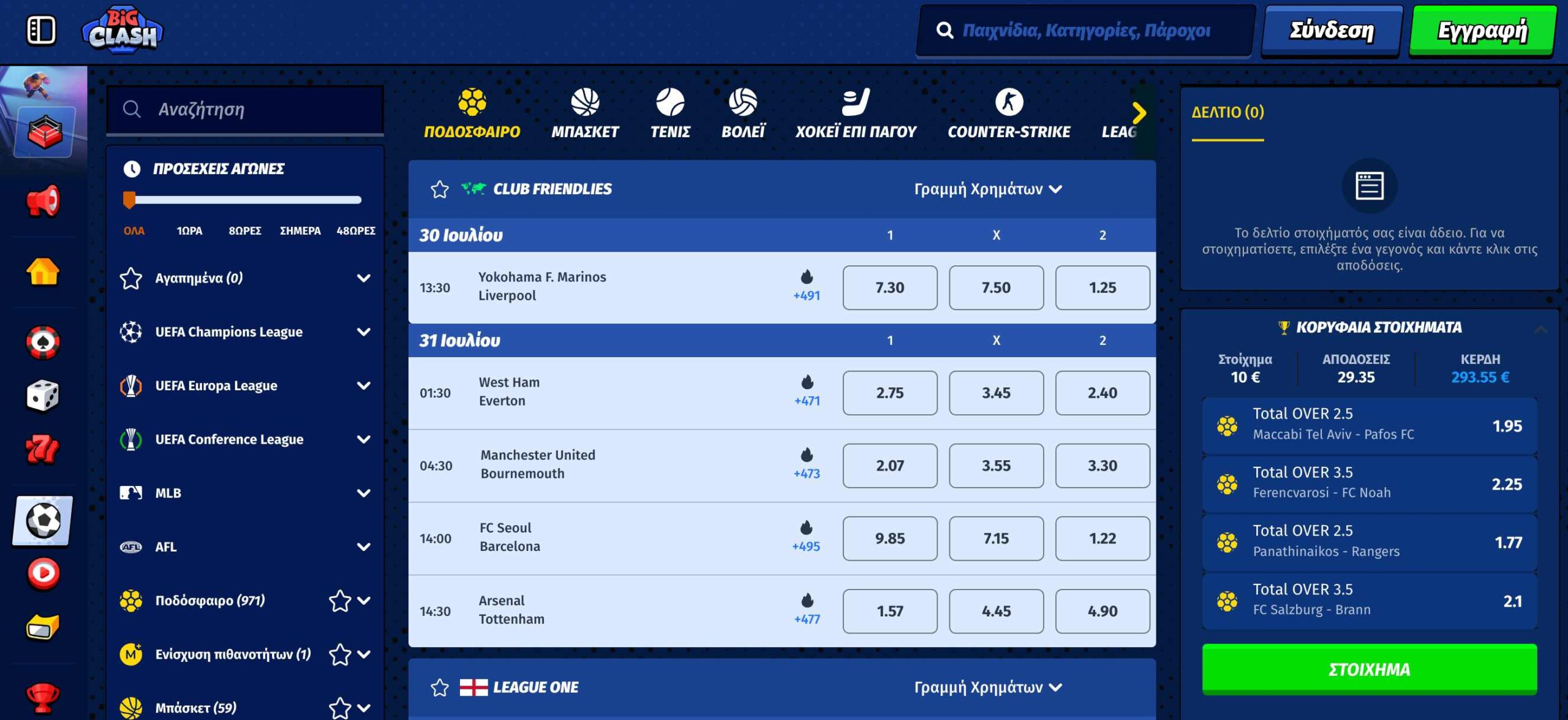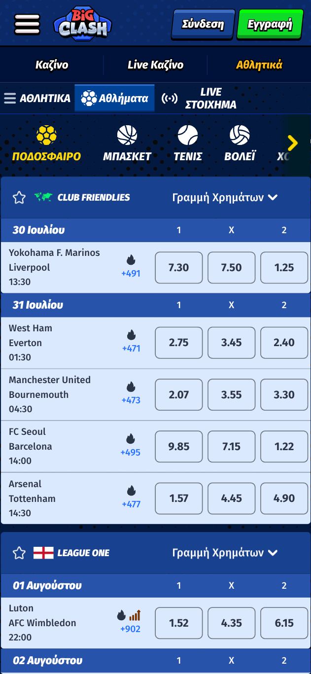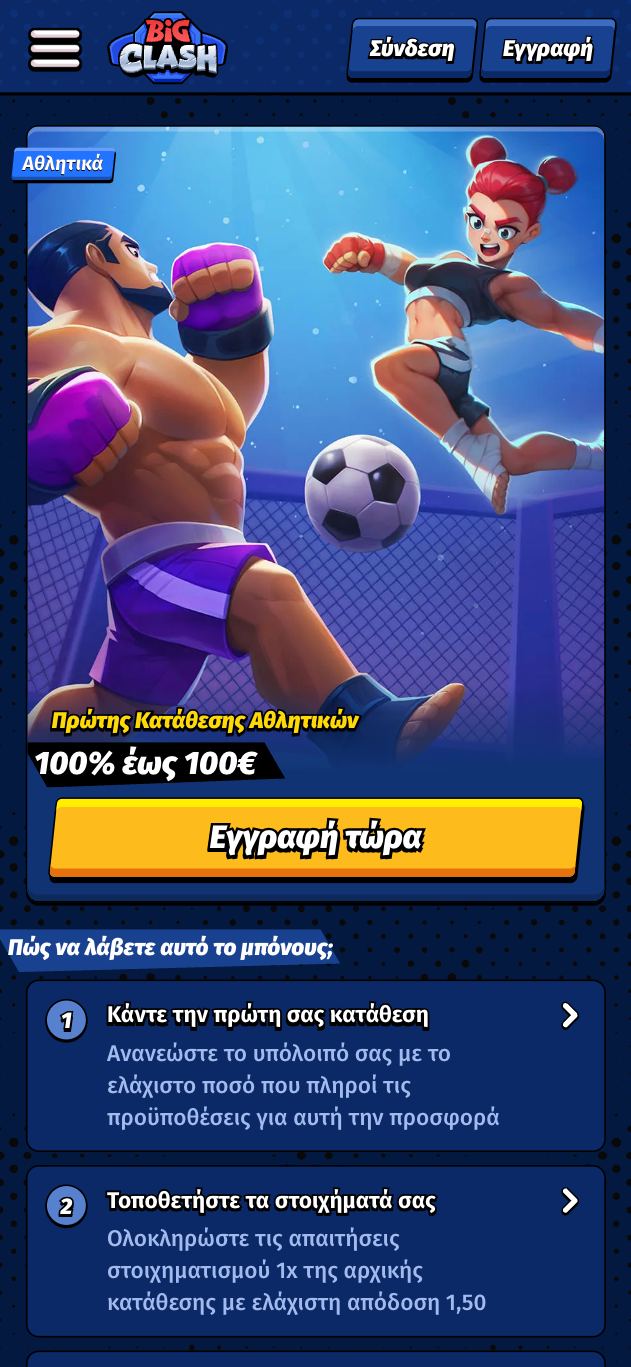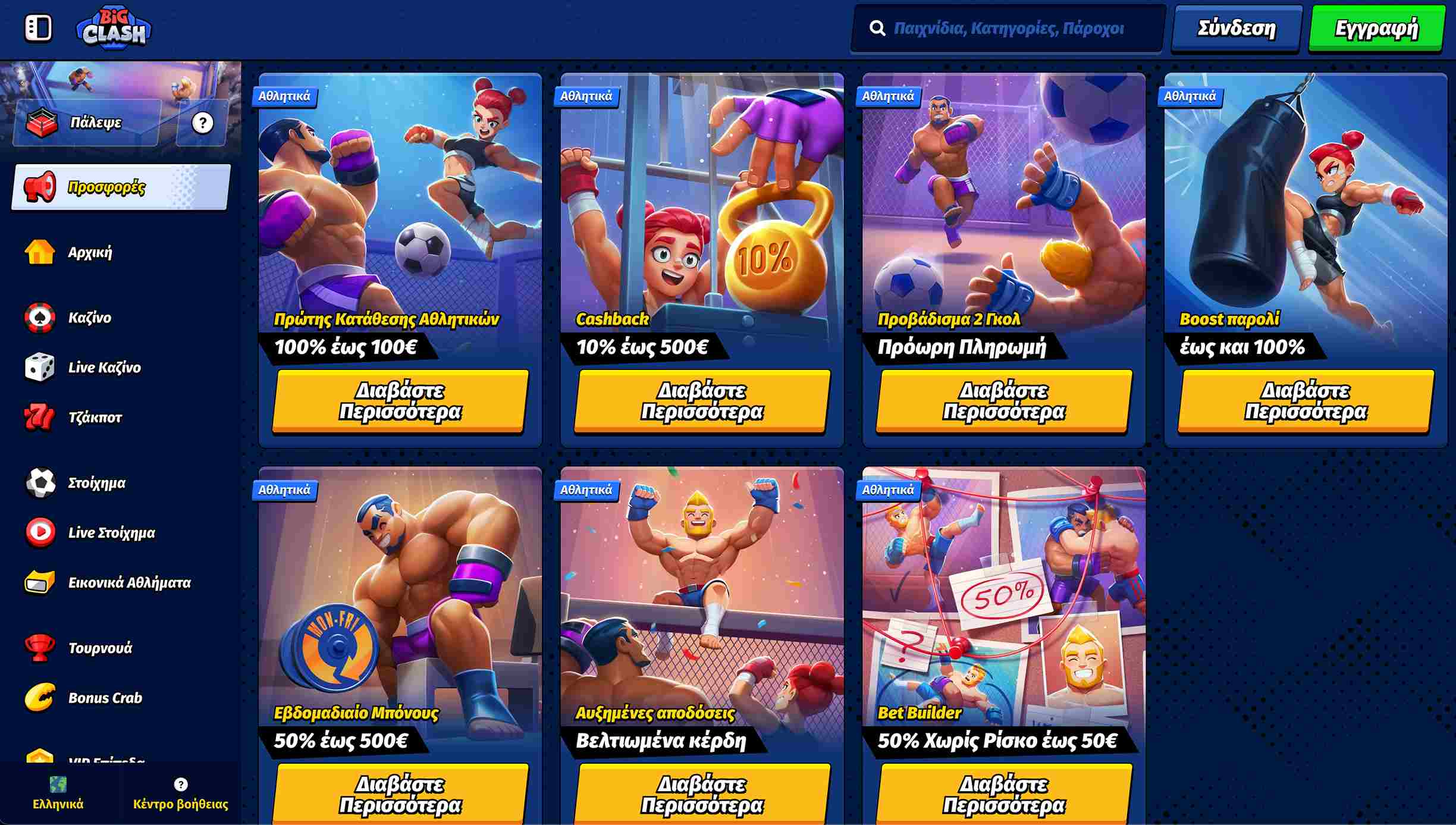 Και δεν είναι μόνο αυτά! Στη BigClash θα βρείτε και πολλούς διαγωνισμούς, τουρνουά και φυσικά πρόγραμμα ανταμοιβής πελατών, που προσφέρει μοναδικά προνόμια στους πιο πιστούς παίκτες. Το VIP πρόγραμμα έχει 5 επίπεδα με σούπερ προσφορές, μεγαλύτερο cashback, υψηλότερα όρια ανάληψης και προσωπικό μάνατζερ για τους χρήστες.