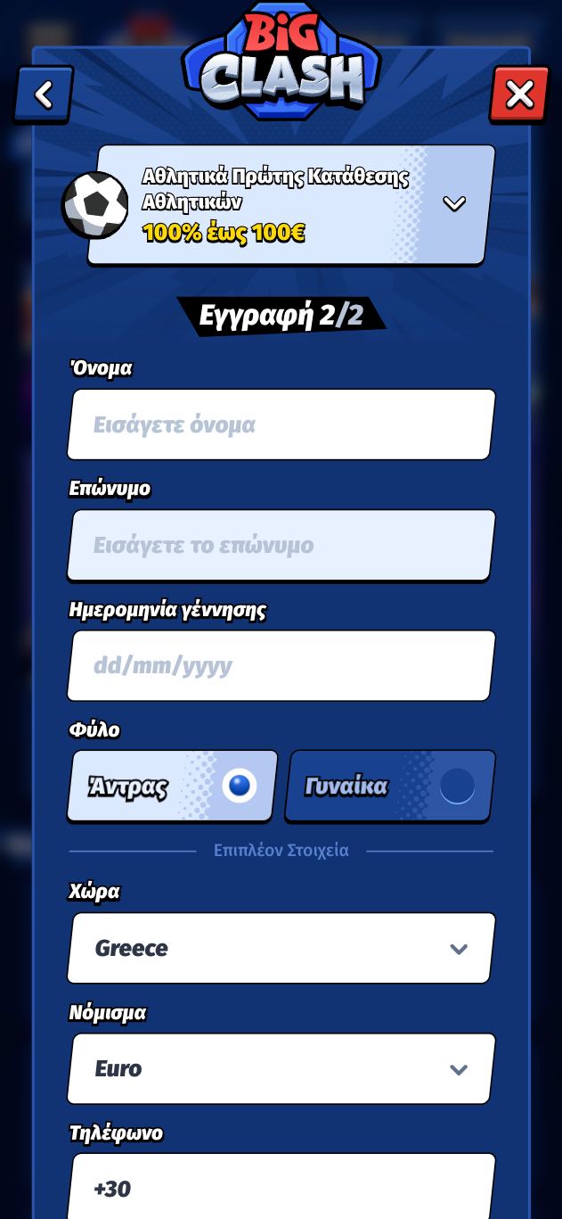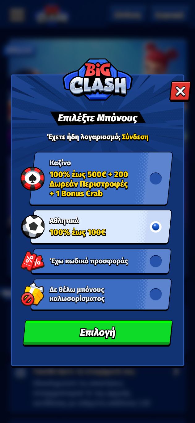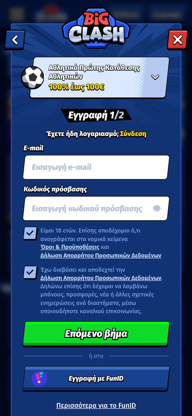 Αν σας άρεσε η στοιχηματική BigClash από την παρουσίαση που σας κάναμε και την ανάλυση που σας προσφέραμε σε αυτή τη σελίδα, τότε δεν έχετε παρά να κάνετε εγγραφή και να ξεκινήσετε να παίζετε στοίχημα. Η διαδικασία είναι πάρα πολύ απλή και πάρα πολύ γρήγορη. Πηγαίνετε στο σάιτ, πατάτε το κουμπί πάνω δεξιά στην οθόνη που λέει “Εγγραφή” και ακολουθείτε τα βήματα: πρώτα επιλέγετε το μπόνους (υπάρχει άλλο μπόνους για το αθλητικό στοίχημα και άλλο για το καζίνο), μετά βάζετε το email και ένα password και τέλος συμπληρώνετε όλα τα στοιχεία που σας ζητάει η πλατφόρμα.