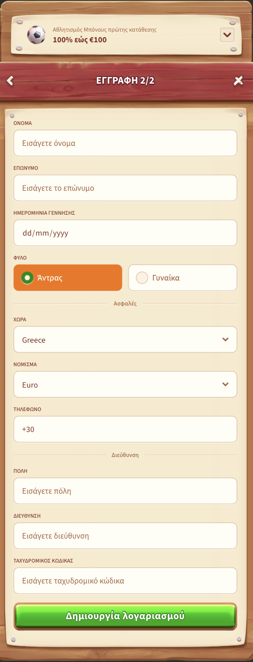 Η εγγραφή στη στοιχηματική BillyBets σαν διαδικασία είναι πολύ εύκολη και γρήγορη και το μόνο που απαιτεί από εσάς είναι να ακολουθήσετε τρία απλά βήματα. Αφού πατήσετε το κουμπί “Εγγραφή” δεξιά πάνω στη σελίδα, ανοίγει το παράθυρο εγγραφής.
