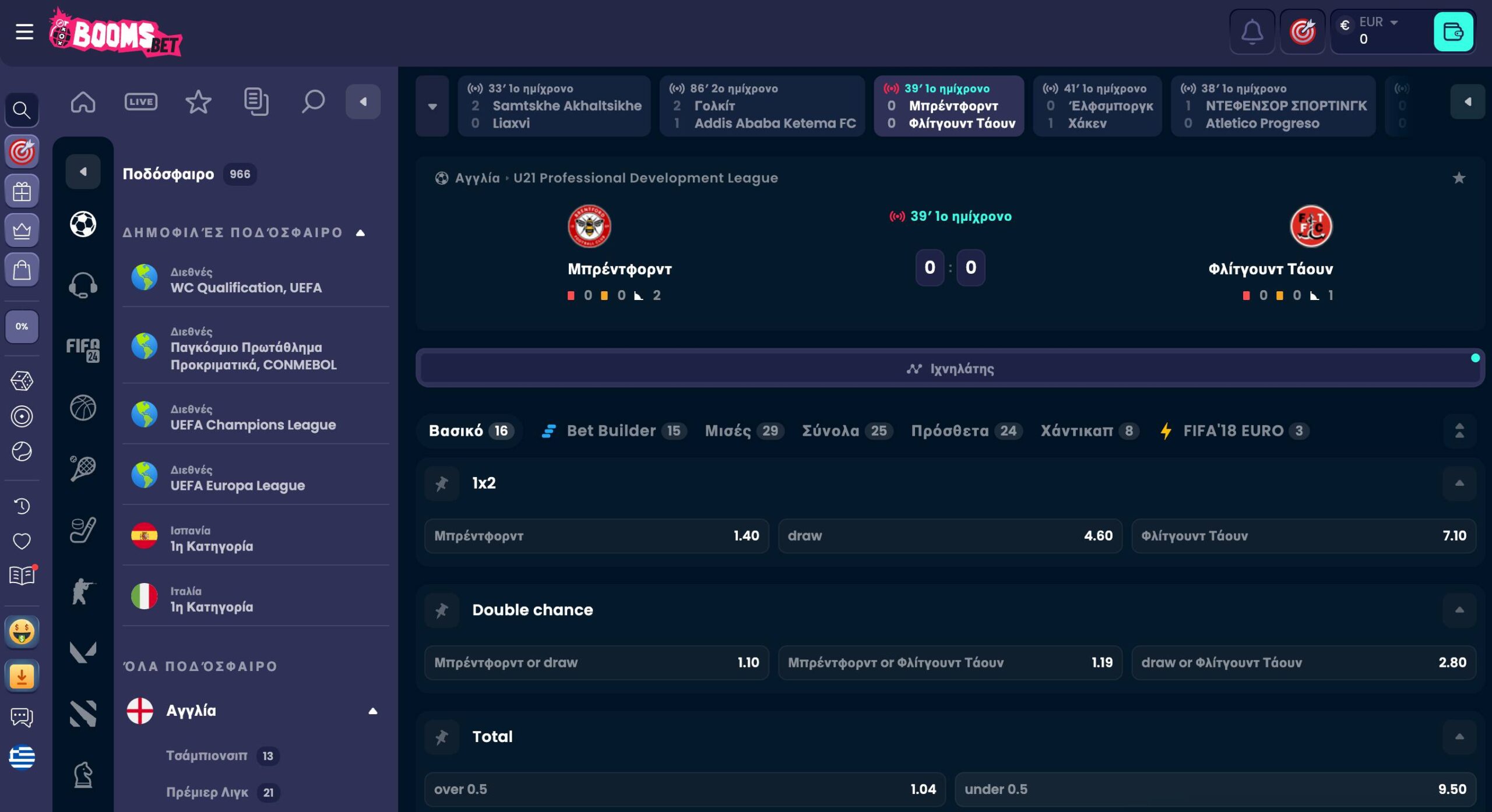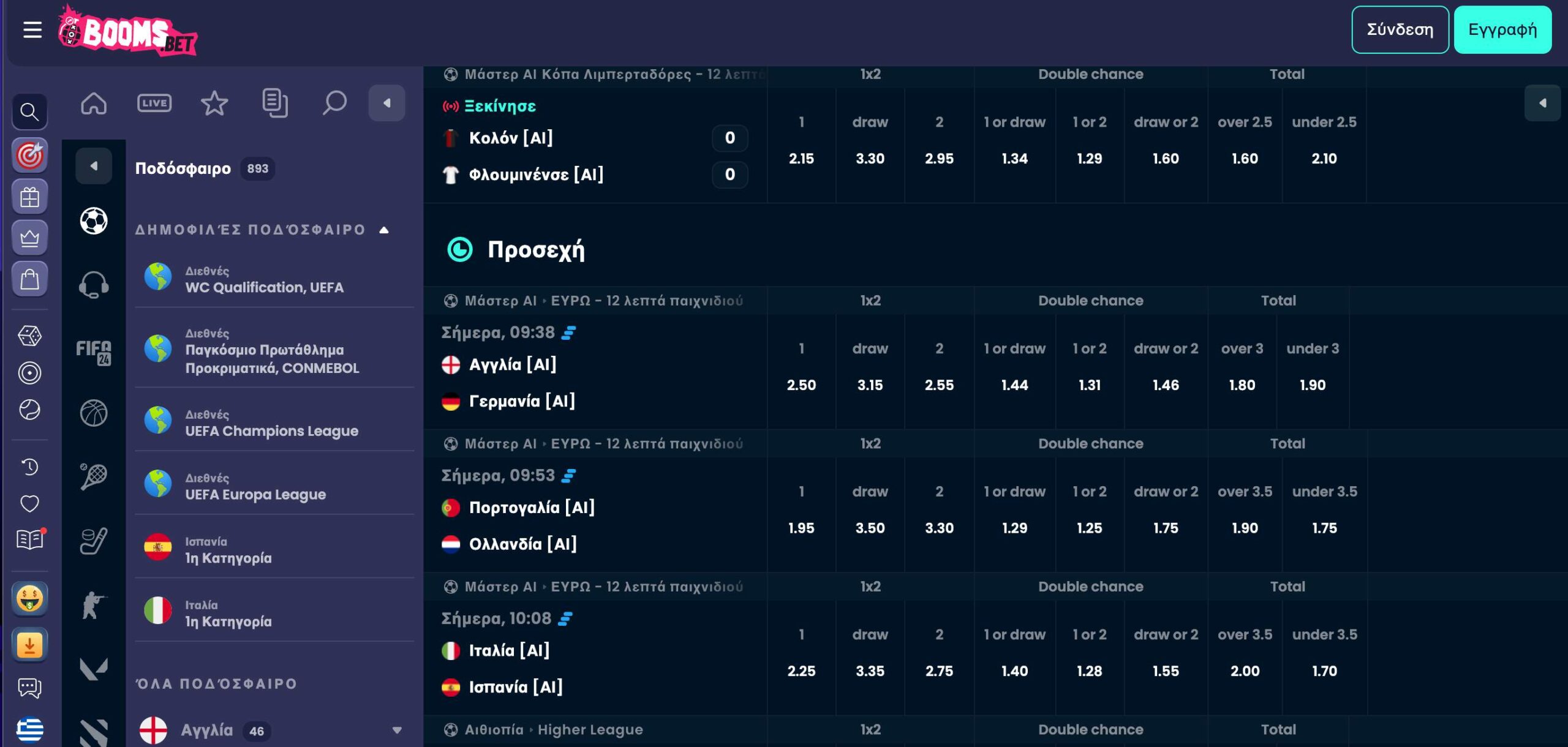 Πάμε τώρα στις αγορές, όπου αυτό που έχουμε δει στη Booms.bet είναι μια αξιόλογη λίστα με διαθέσιμα στοιχήματα. Στα κορυφαία γεγονότα και στους πρωτοκλασάτους αγώνες, η ποικιλία είναι πολύ μεγάλη. Αλλά και γενικότερα στα μεγάλα αθλητικά events, θα βρείτε αμέτρητες επιλογές που συμπεριλαμβάνουν: 1×2, διπλή ευκαιρία, σύνολα (over/under), ισοπαλία όχι στοίχημα, γκολ γκολ, ασιατικά, κόρνερ, κάρτες, ειδικά παικτών και ομάδων και πάρα πολλές επιλογές στην κάθε αγορά. Επίσης προσφέρεται και Bet Builder με πολλές επιλογές και εδώ, για να γίνει ακόμα πιο ενδιαφέρον το χτίσιμο ενός κουπονιού!