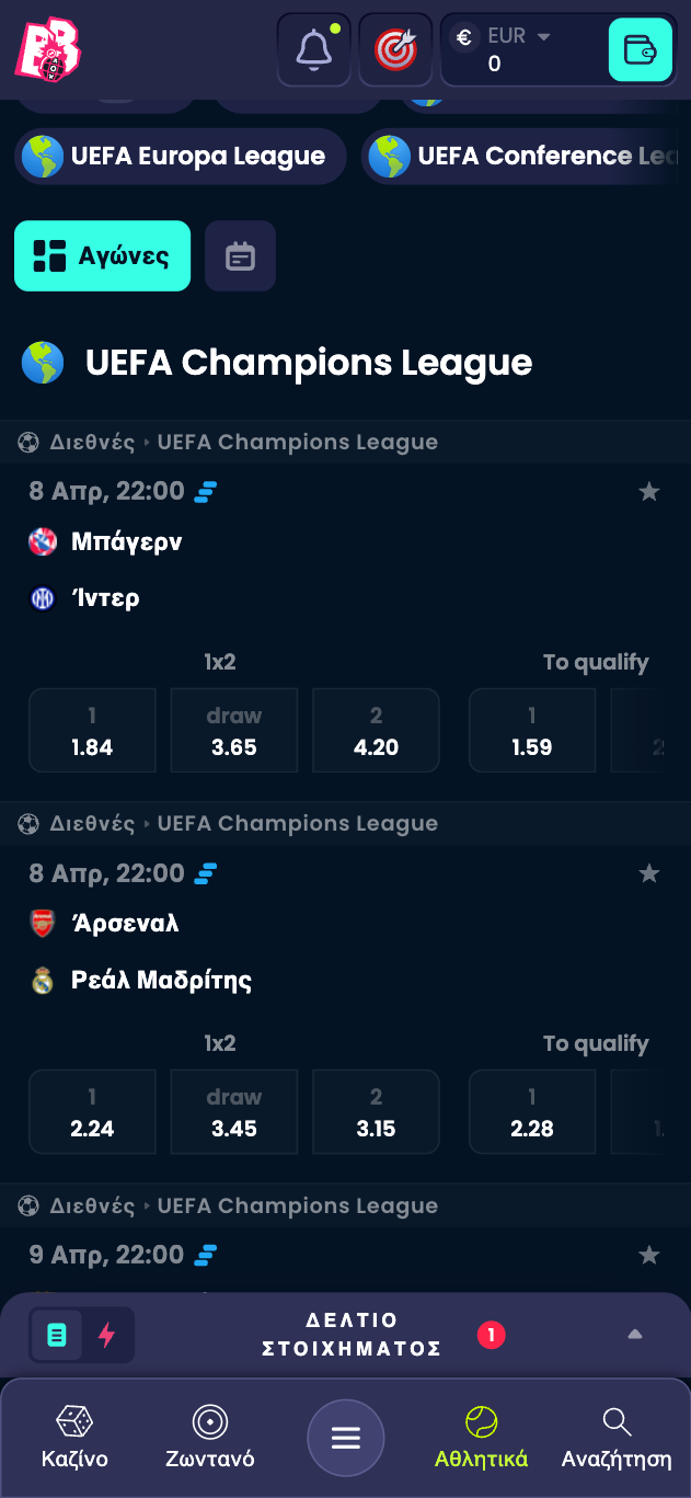 Για να στοιχηματίσετε – που αυτό είναι και το ζητούμενο – το μόνο που χρειάζεται να κάνετε είναι να επιλέξετε το κουμπί με τα αθλήματα και θα σας ανοίξει ένα νέο μενού με όλες τις δημοφιλείς διοργανώσεις, τις κορυφαίες λίγκες και τα αγαπημένα σας γεγονότα (εδώ πρέπει εσείς να προσθέσετε τα γεγονότα που θέλετε να έχετε σε αυτή τη λίστα) ενώ από κάτω θα ανοίξουν όλα τα διαθέσιμα σπορ. Επιλέγοντας το σπορ και το πρωτάθλημα που θέλετε, ανοίγει στο κέντρο της σελίδας η λίστα με όλα τα διαθέσιμα γεγονότα (ματς), ενώ πατώντας πάνω σε ένα ματς μπορείτε να μπείτε σε όλες τις αγορές. Για να στοιχηματίσετε το μόνο που πρέπει να κάνετε είναι να πατήσετε πάνω στην απόδοση και αμέσως θα σας ανοίξει το δελτίο στα αριστερά. Εκεί θα βάλετε το ποσό που θέλετε να ποντάρετε, θα επιβεβαιώσετε το στοίχημα και μόλις γίνει αποδεκτό, τελειώσατε!