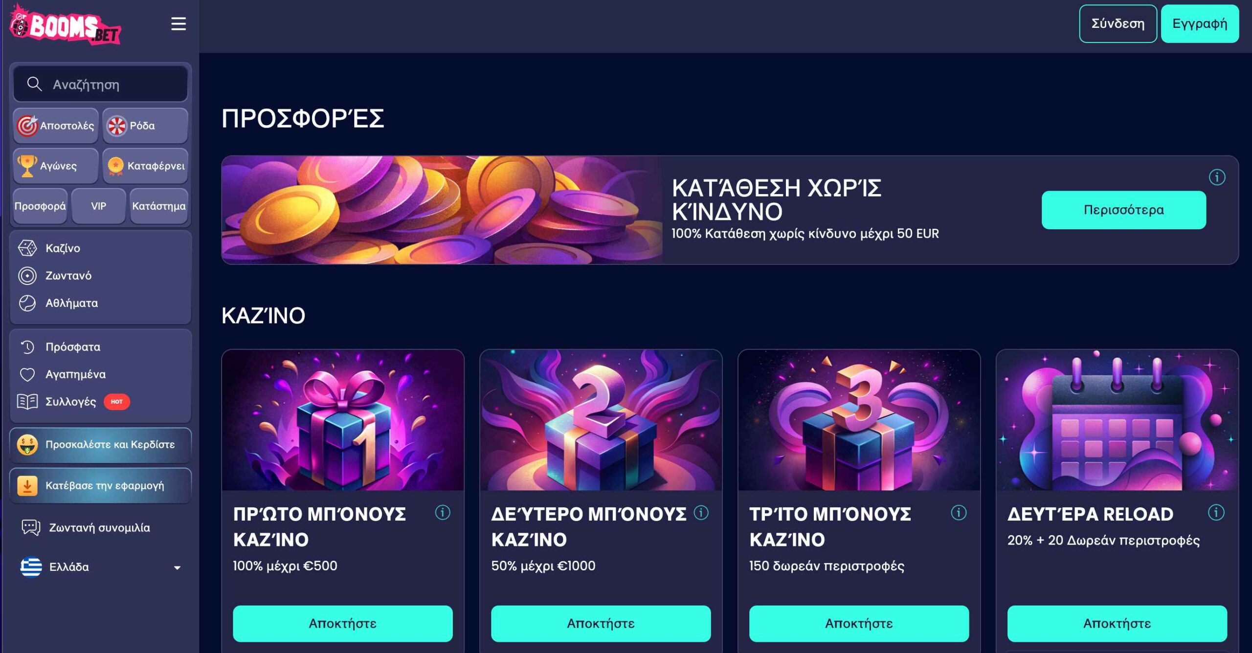 Με την πρώτη κατάθεση, η Βooms.bet σας δίνει μπονους 50% του ποσού, έως 50€ και 25 free spins. H ελάχιστη κατάθεση για να μπορέσετε να πάρετε το μπόνους είναι 25€, ενώ οι απαιτήσεις στοιχηματισμού είναι x15 σε αγορές με απόδοση τουλάχιστον 1.90.