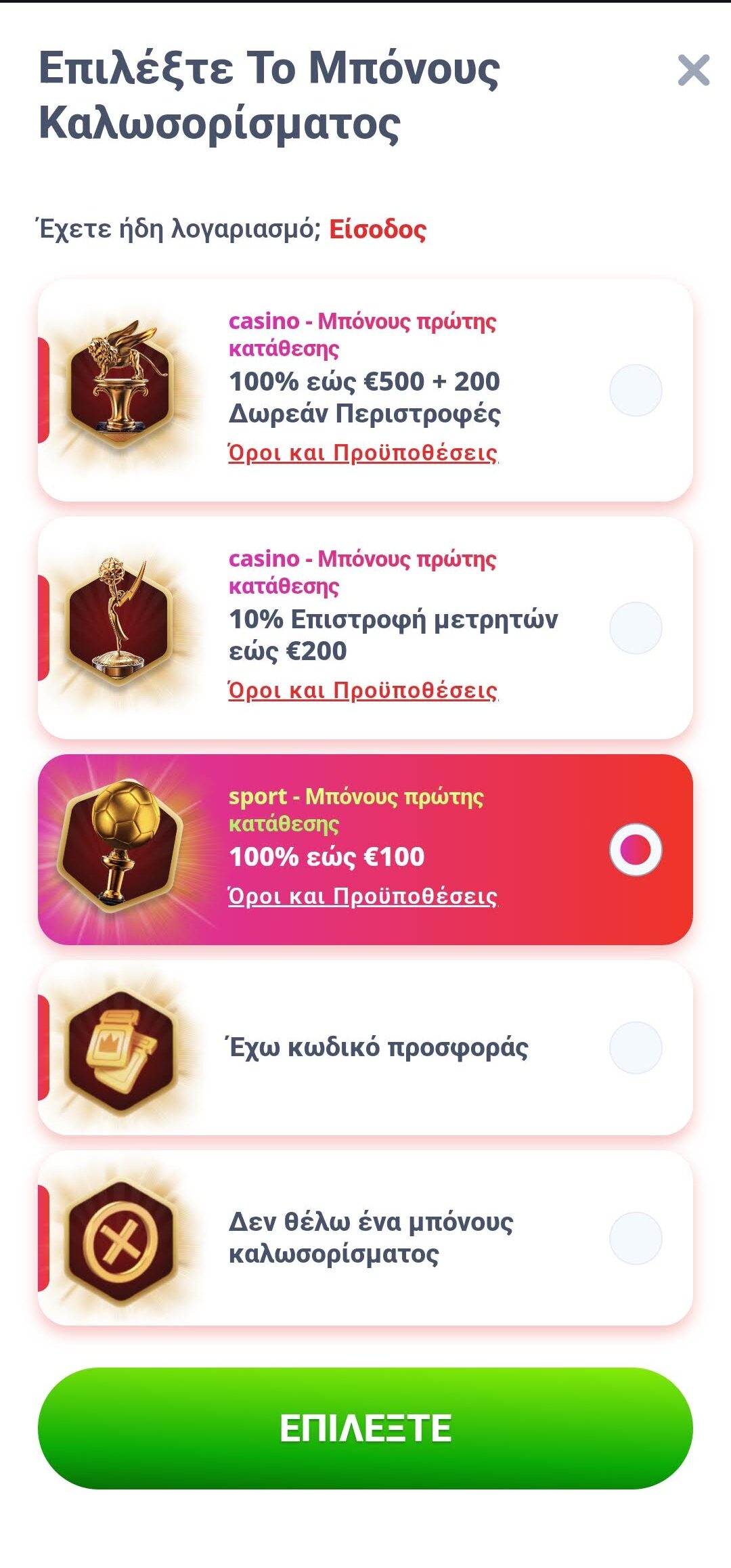- Κάντε κλικ στο κουμπί «Εγγραφή». Επιλέξτε την προσφορά που θέλετε να πάρετε ως μπόνους εγγραφής (αν δε θέλετε μπορείτε να προχωρήσετε χωρίς να διεκδικήσετε μπόνους)