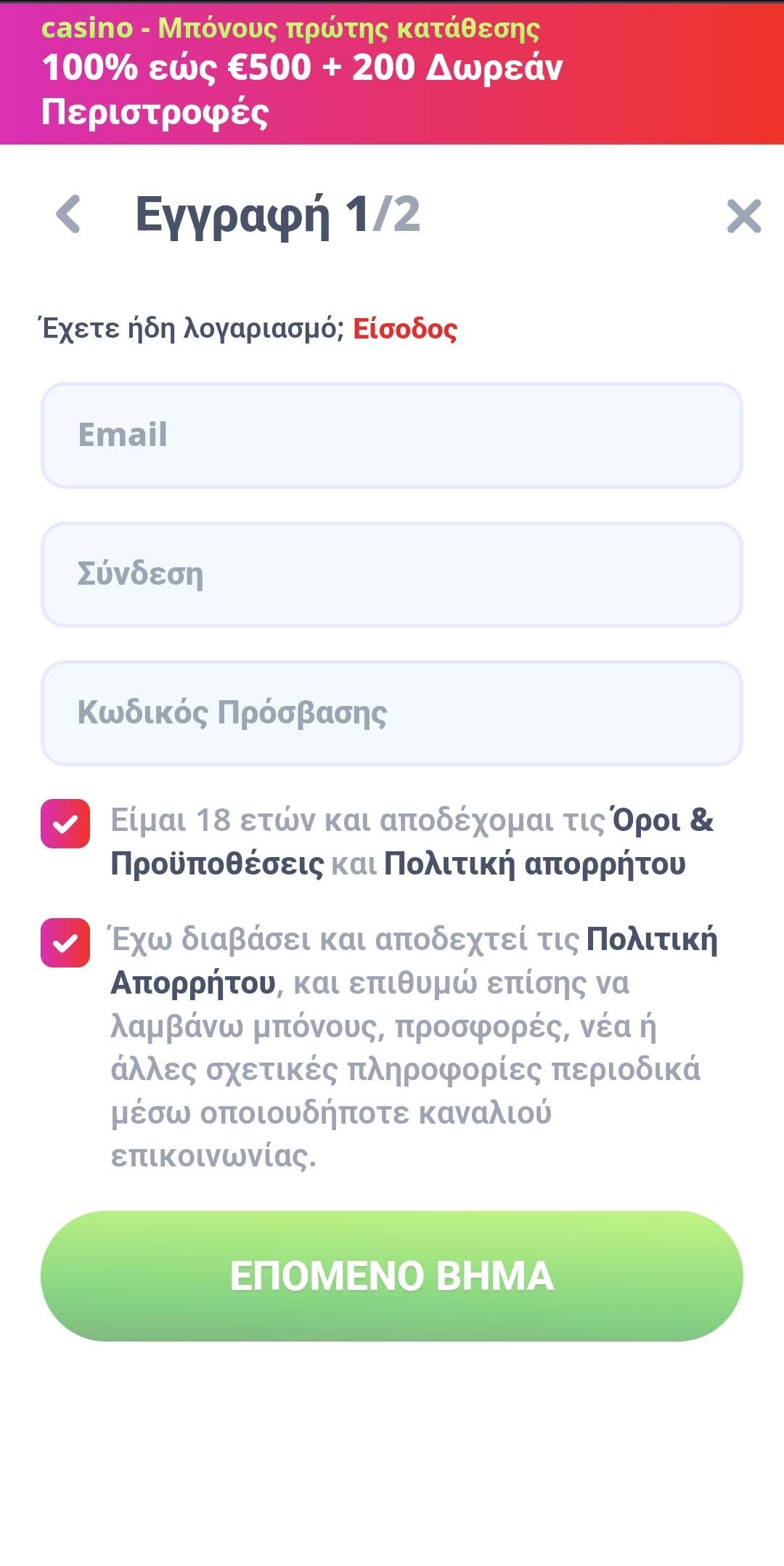 - Καταχωρήστε τη διεύθυνση ηλεκτρονικού ταχυδρομείου σας και του προτιμώμενου κωδικού πρόσβασης. Επιβεβαιώστε την ηλικία σας και αποδεχτείτε τους όρους και τις προϋποθέσεις του Casino Infinity καθώς και την πολιτική απορρήτου