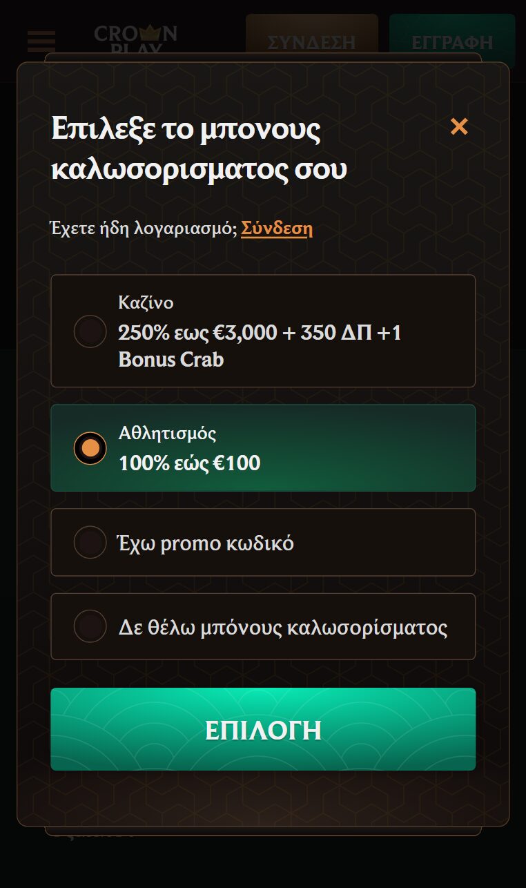 Το μπόνους καλωσορίσματος είναι αυτό που θα περίμενε κανείς, βάσει του πως κινείται η αγορά. Η εγγραφή σας στην CrownPlay έρχεται με ένα μπόνους 100% της πρώτης κατάθεσης έως τα 100 ευρώ.