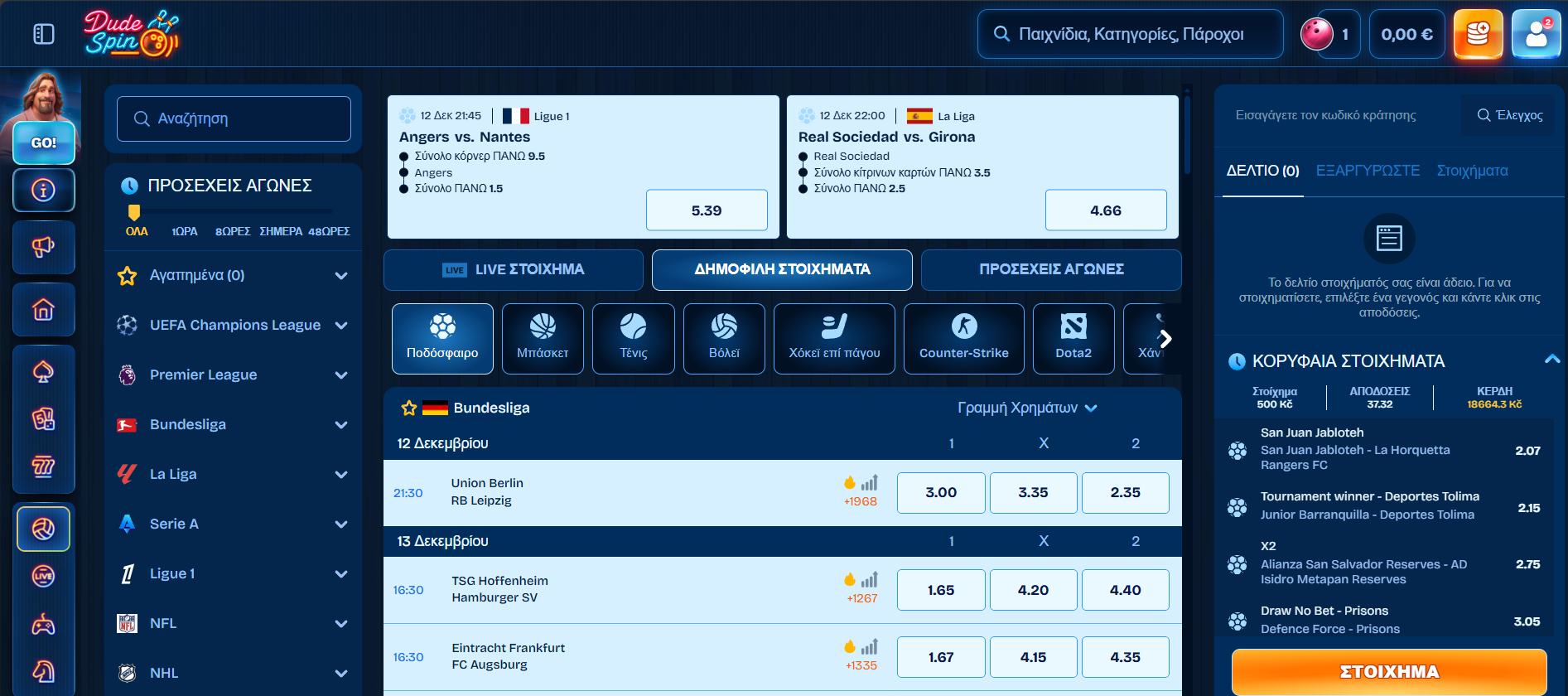 Η στοιχηματική DudeSpin καλύπτει καθημερινά εκατοντάδες γεγονότα, δίνοντας ιδιαίτερη έμφαση στην τεράστια ποικιλία διαθέσιμων αγορών και τις δίκαιες αποδόσεις.