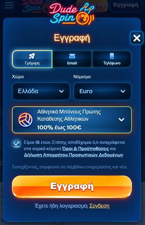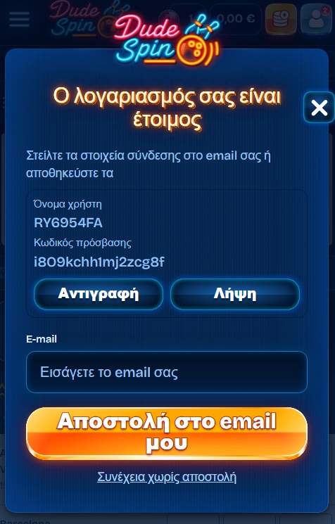 Η διαδικασία εγγραφής στη DudeSpin είναι εξαιρετικά γρήγορη, καθώς υπάρχει δυνατότητα εγγραφής χρησιμοποιώντας μόνο το email σας.