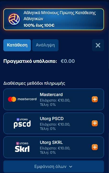 | Εβδομαδιαίο Μπόνους | Μία φορά κάθε εβδομάδα | Με ελάχιστη κατάθεση 20€, μπόνους 50% έως 500€ με 8x απαίτηση πονταρίσματος (ισχύουν οι ίδιοι όροι με το welcome bonus) |