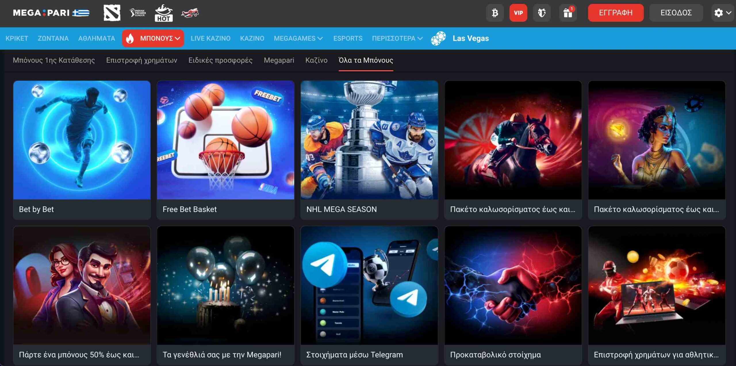 | Email support@megapari.com τηλεφωνική επικοινωνία και live chat 24/7 | Mastercard, VISA, MiFINITY, Jeton, Kvitum, κρυπτονομίσματα | ✅ | Μπόνους εγγραφής, Μπόνους κατάθεσης, Cashback, Ενισχυμένες αποδόσεις, boost συνδυαστικού στοιχήματος | Εγγραφή | |