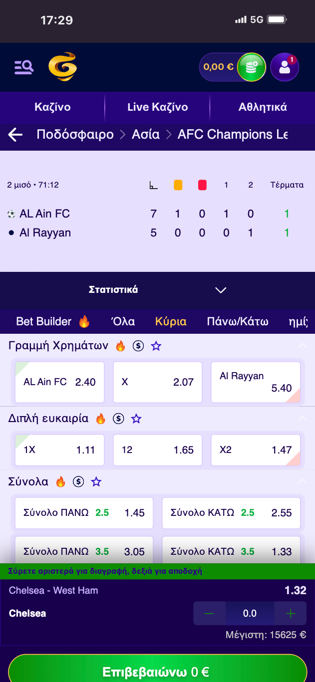 Μεγάλο μέρος του pregame θα το βρείτε και στο live betting, από άποψη αθλημάτων αλλά και ως ένα βαθμό από άποψη αγορών. Δεν είναι τόσο μεγάλη η ποικιλία, όμως οι βασικές αγορές είναι όλες εκεί. Έχει και καλό bet builder – όπως και στο pregame – με πολλές επιλογές, που κάνουν την παρακολούθηση οποιουδήποτε αγώνα ακόμα πιο ενδιαφέρουσα αλλά και το live στοίχημα ακόμα πιο δυνατό.