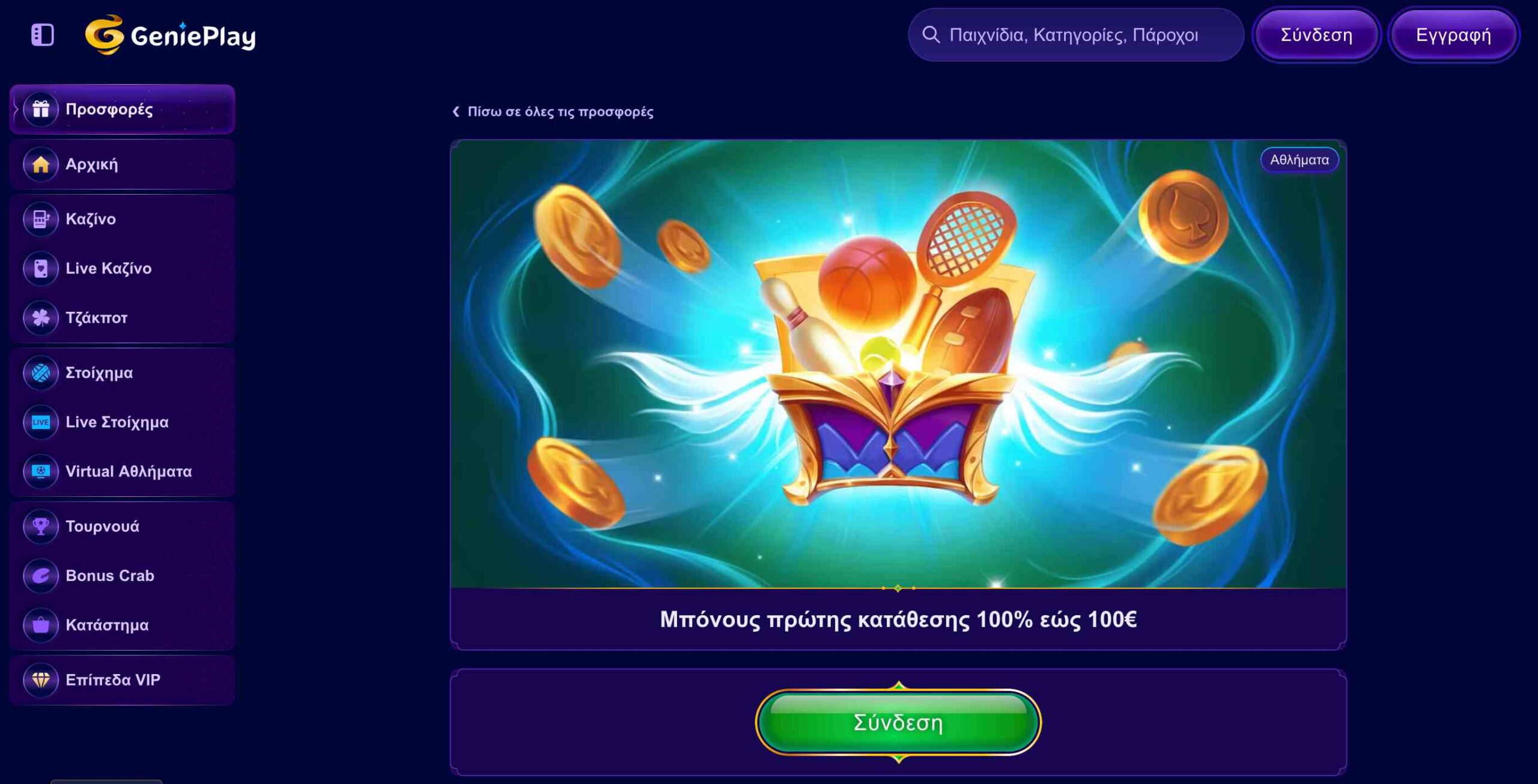 Στη GeniePlay ξεχωρίζουν οι προωθητικές ενέργειες και είναι βέβαιο πως θα μείνετε ικανοποιημένοι από τα μπόνους και τις προσφορές που τρέχουν όλη τη διάρκεια του χρόνου. Όσοι κάνουν εγγραφή στην πλατφόρμα, επωφελούνται από την προσφορά γνωριμίας που δίνει δώρο 100% της αξίας της πρώτης κατάθεσης, με ανώτερο ποσό τα 100€. Πολύ απλά αν καταθέσει ο παίκτης έως 100€, θα λάβει άλλα τόσα! Η προϋπόθεση για αυτό είναι η κατάθεση να είναι τουλάχιστον 20€ και να γίνει με oποιαδήποτε μέθοδο εκτός από τη Skrill και τη Neteller.