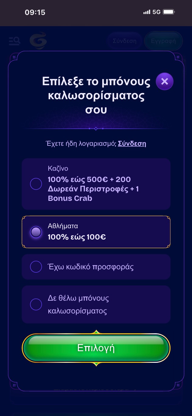 1ο βήμα: Επισκεφτείτε τον ιστότοπο και πατήστε το πράσινο κουμπί “Εγγραφή” που θα δείτε πάνω δεξιά στη σελίδα. Θα ανοίξει ένα παράθυρο, όπου θα σας ζητήσει να επιλέξετε το μπόνους – είτε στοιχηματικό είτε για το καζίνο του GeniePlay- ή και να συνεχίσετε χωρίς μπόνους. Μόλις επιλέξετε, πατήστε το κουμπί “Επιλογή”