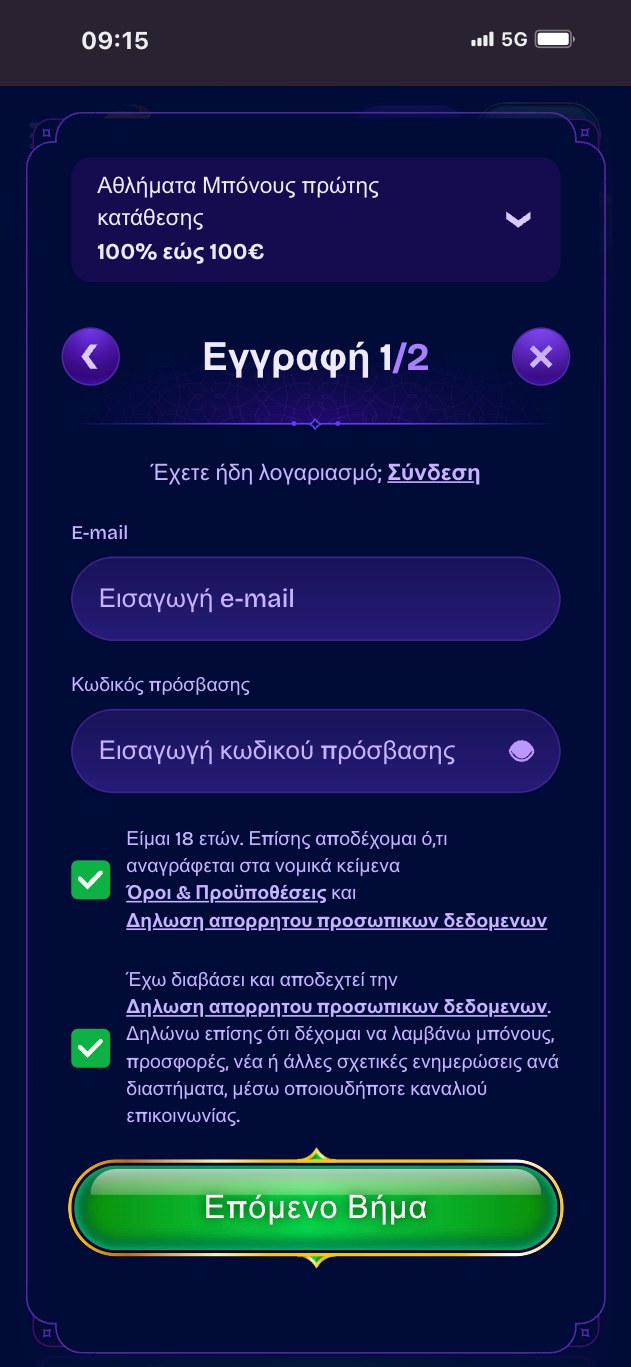 2ο βήμα: Στο παράθυρο που θα ανοίξει, συμπληρώστε το email σας και δημιουργήστε το password που θέλετε να έχετε για να μπαίνετε στην πλατφόρμα. Επιβεβαιώστε την ηλικία, αποδεχτείτε τους Όρους & Προϋποθέσεις αλλά και την Πολιτική Απορρήτου και πατήστε το κουμπί “Επόμενο Βήμα”