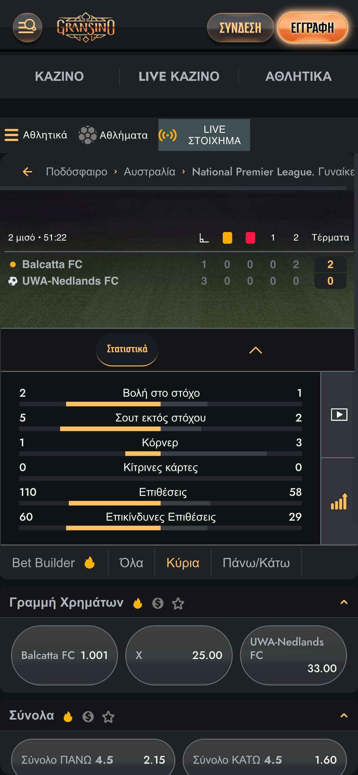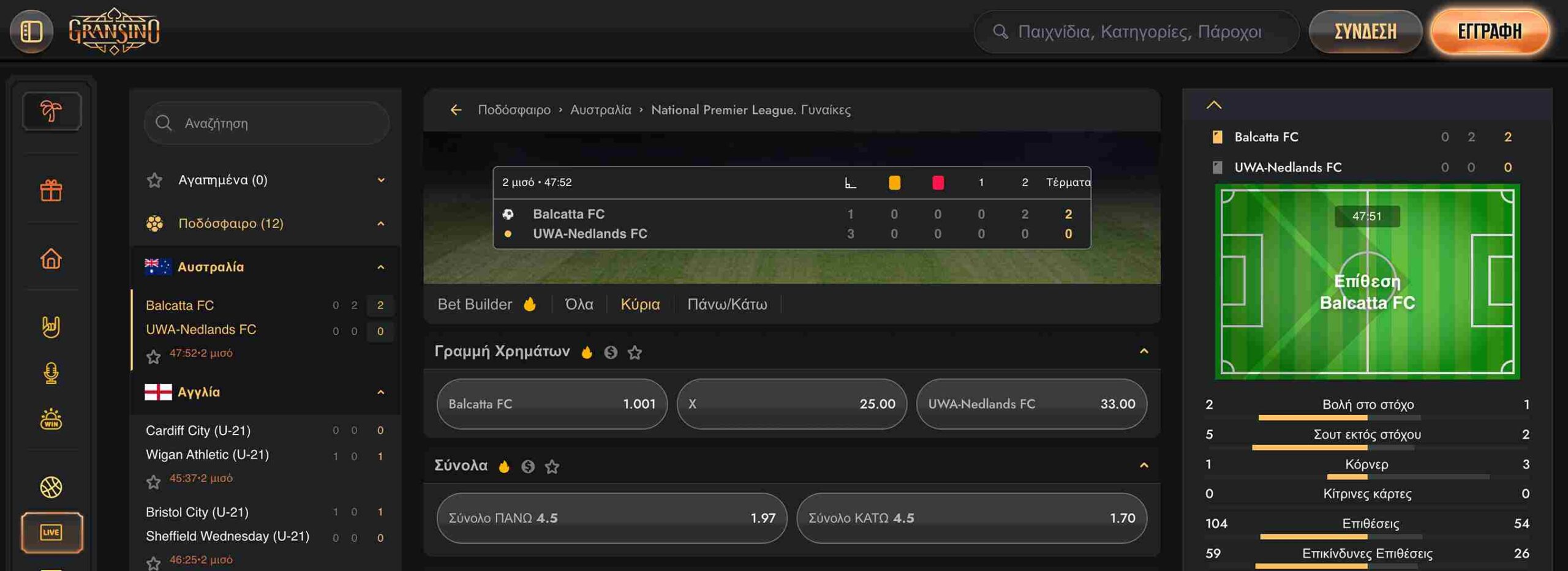 Παράλληλα, μπορείτε να δείτε και τον ακριβή αριθμό των αγορών που είναι διαθέσιμες για την εκάστοτε αναμέτρηση. Η πλατφόρμα στο ζωντανό στοίχημα σας ενημερώνει με στοχευμένα στατιστικά για την εξέλιξη του αγώνα, ενώ φυσικά υπάρχει και η γηπεδάκι για να ενημερώνεστε για την εξέλιξη των αγώνων.