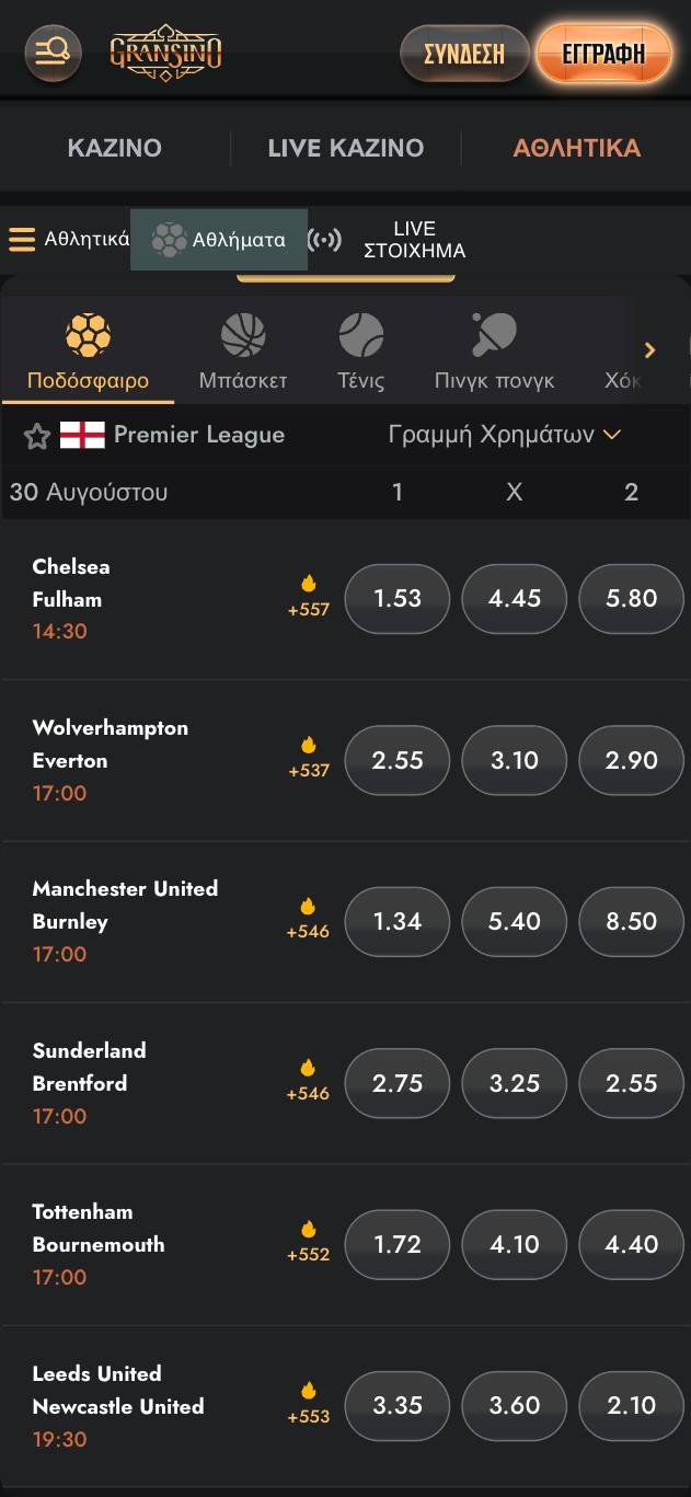Η στοιχηματική πλατφόρμα της Gransino δείχνει αρκετά πλήρης, ώστε να μπορεί να ανταποκριθεί και απέναντι στον σκληρό ανταγωνισμό. Η ενότητα με τα αθλητικά περιλαμβάνει δεκάδες δημοφιλή σπορ, ενώ σε ότι έχει να κάνει με τον αριθμό των αγορών και των επιλογών, υπάρχουν πολλές περισσότερες επιλογές στο ποδόσφαιρο και το μπάσκετ.
