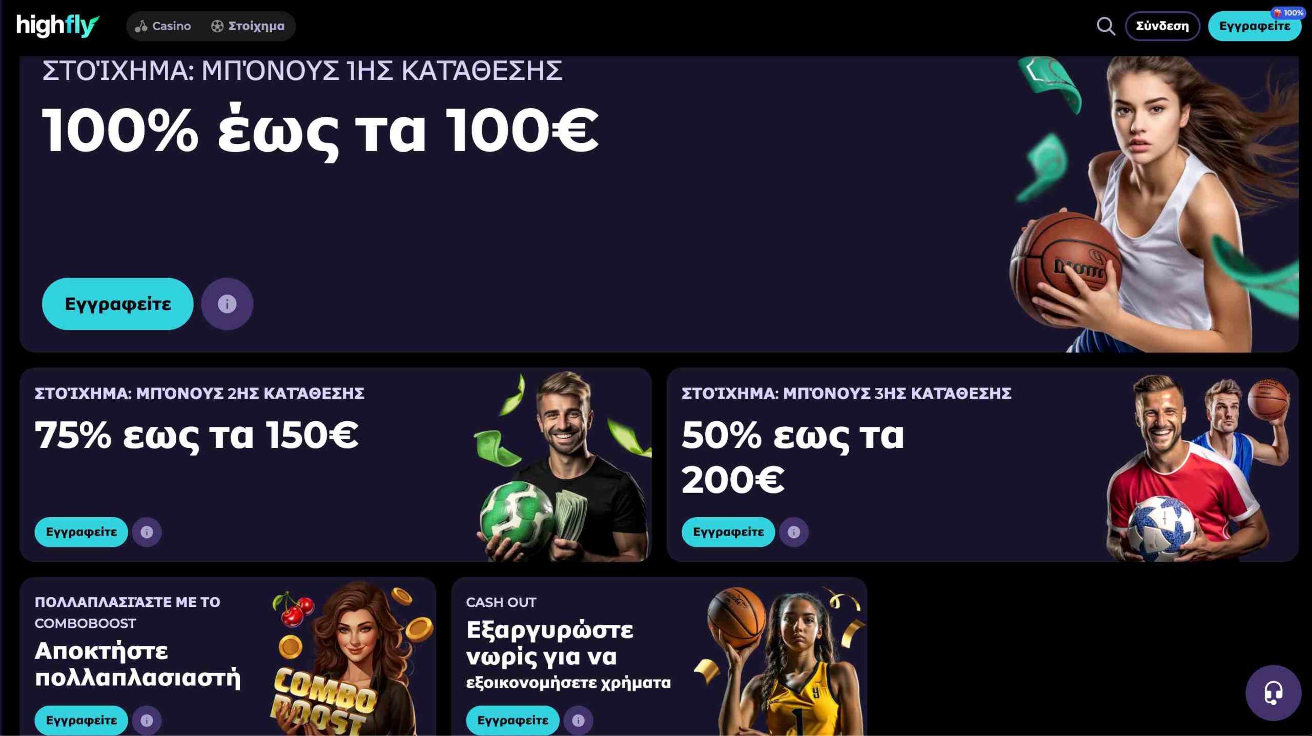 Αρχικά, η προσφορά εγγραφής στη HighFlyBet δεν είναι αυτή που βλέπουμε στην πλειοψηφία των στοιχηματικών εταιριών, δηλαδή ένα μπόνους πρώτης κατάθεσης. Η προσφορά εγγραφής είναι ουσιαστικά ένα πακέτο καλωσορίσματος με μπόνους στις πρώτες τρεις καταθέσεις που θα κάνετε! Το πακέτο αυτό μπορεί να φτάσει έως τα 450€!
