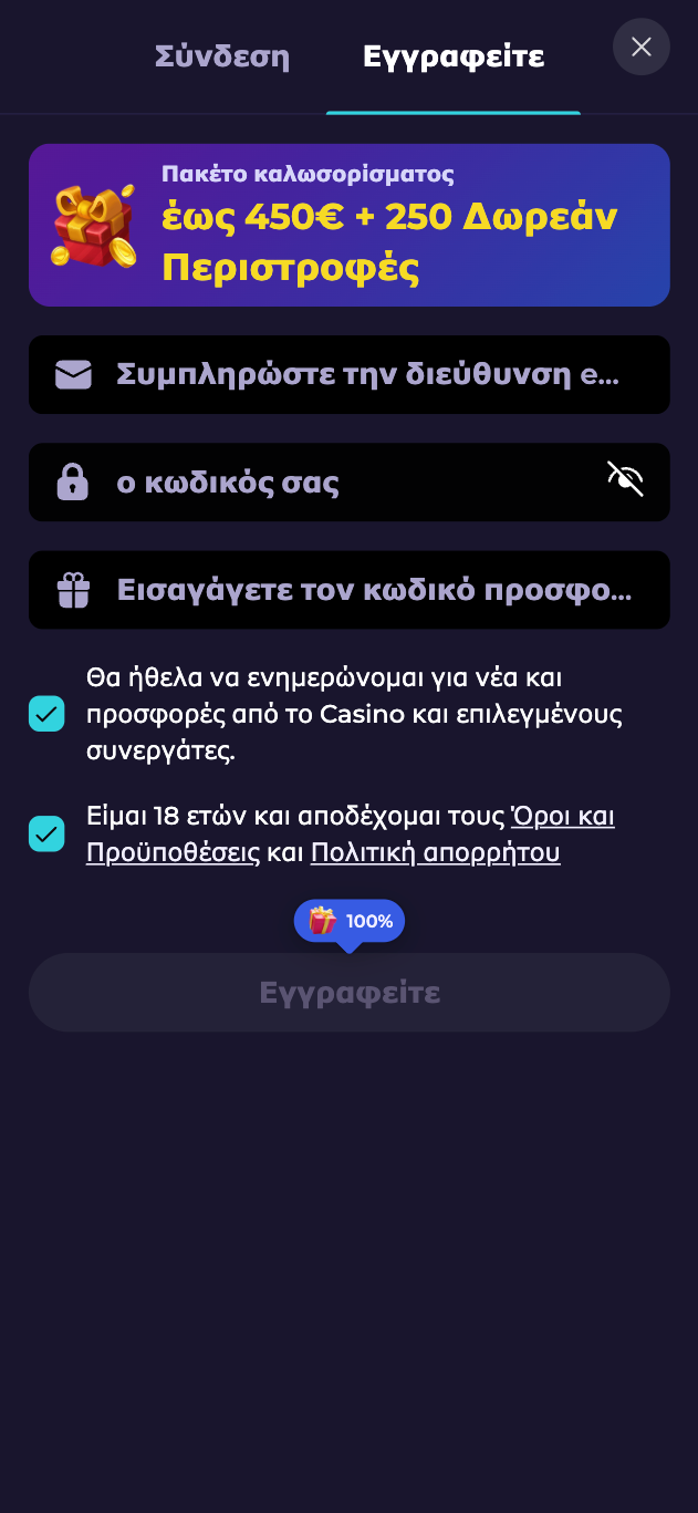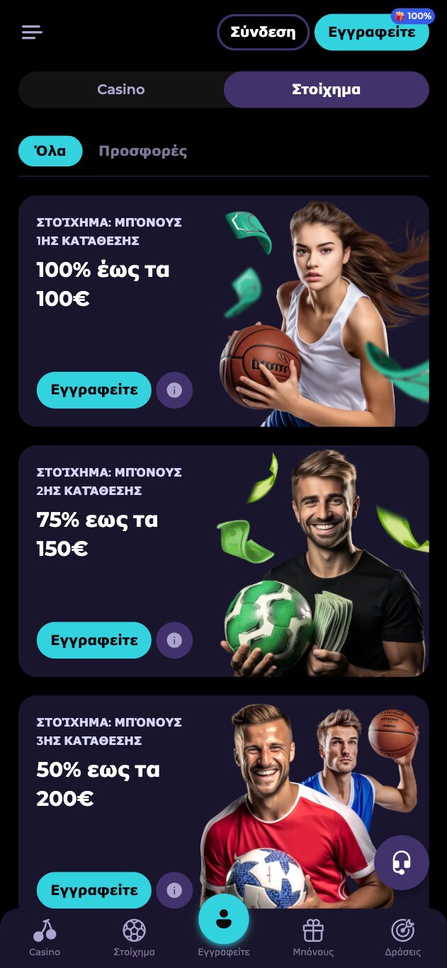 Σε πρώτη φάση είναι το μπόνους 100% στην πρώτη κατάθεση ως 100€. Τι σημαίνει αυτό; Σημαίνει, πως μετά την εγγραφή σας και μόλις πραγματοποιήσετε την πρώτη σας κατάθεση θα πάρετε 100% επιπλέον στο υπόλοιπό σας – ή αλλιώς διπλασιασμό των χρημάτων. Φυσικά έχει και μάξιμουμ μπόνους, που στην προκειμένη είναι τα 100€!