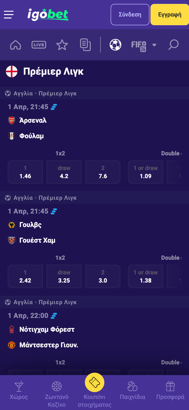 Στο live betting η IgoBet έχει αρκετά ενδιαφέρουσα λίστα με αθλήματα αλλά και έναν μεγάλο κατάλογο με αγορές. Αρχικά να πούμε πως μπορείτε να στοιχηματίσετε σχεδόν σε όλα τα σπορ που προσφέρονται και στο pregame και φυσικά και σε όλα τα eSports – υπάρχει πολύ μεγάλη ποικιλία και εδώ.