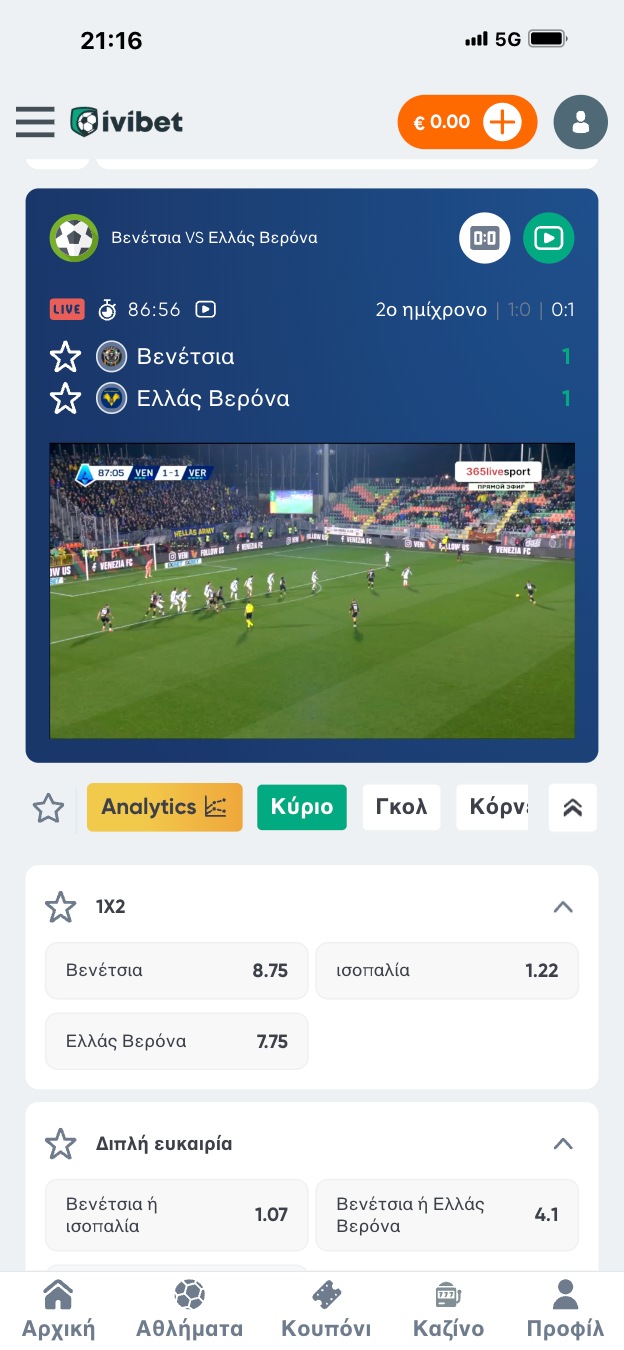 Στο live betting αυτό που ξεχωρίζει στην περίπτωση της Ιvibet είναι το live streaming, το οποίο προσφέρεται σε πάρα πολλά γεγονότα, πάρα πολλές διοργανώσεις και σε κορυφαία events, όχι μόνο σε μικρές λίγκες και αγώνες. Για να παρακολουθήσετε ζωντανά έναν αγώνα πρέπει πρώτα να κάνετε εγγραφή και έτσι μπορείτε να ζείτε όλη την δράση, την ένταση αλλά και την μαγεία του ζωντανού στοιχηματισμού στο full!