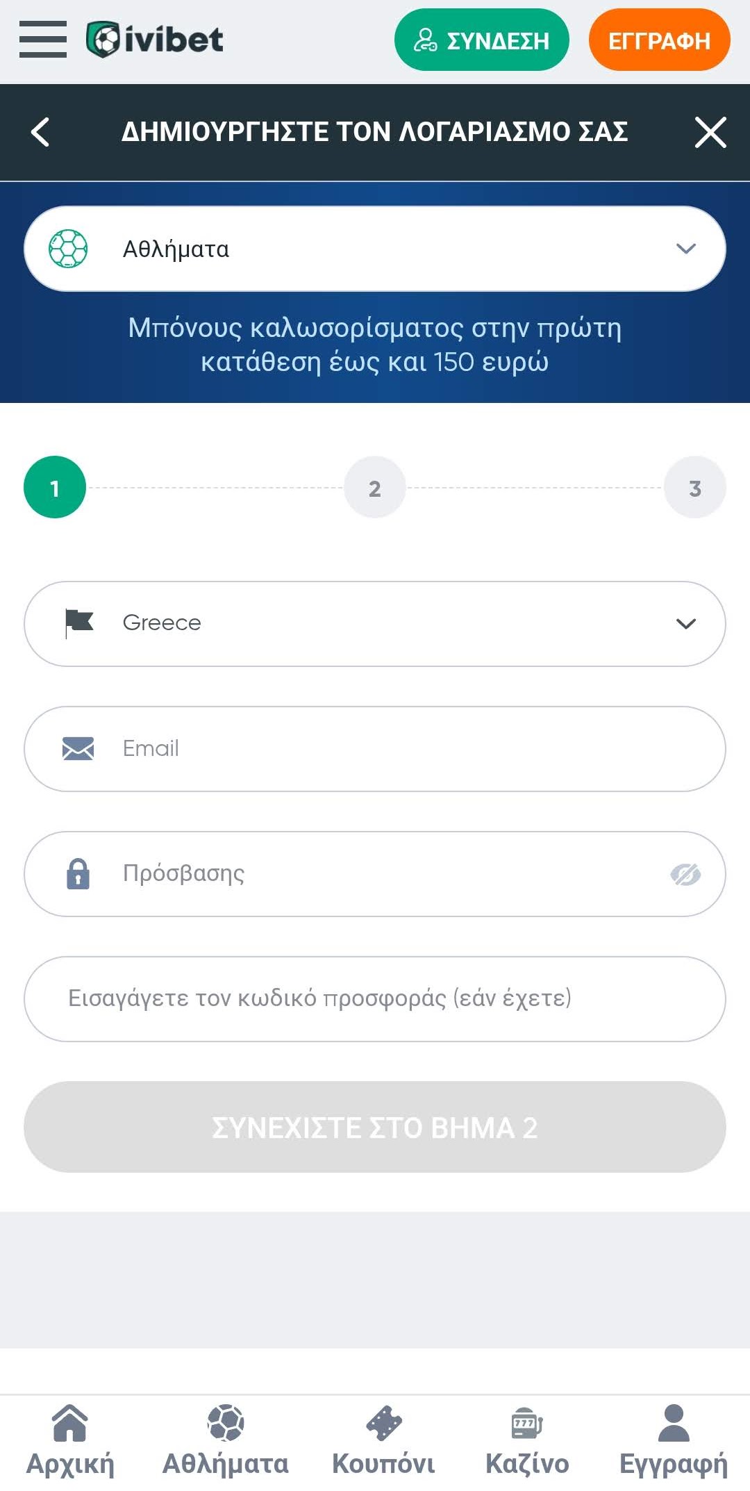 1ο βήμα: Μπείτε στον ιστότοπο και πατήστε το κουμπί “Εγγραφή” που βρίσκεται στην πάνω δεξιά γωνία της σελίδας. Θα ανοίξει ένα παράθυρο, όπου πρέπει να επιλέξετε το μπόνους που θέλετε (είτε για το στοίχημα είτε για το καζίνο), να συμπληρώσετε το email σας και να δημιουργήσετε έναν κωδικό πρόσβασης