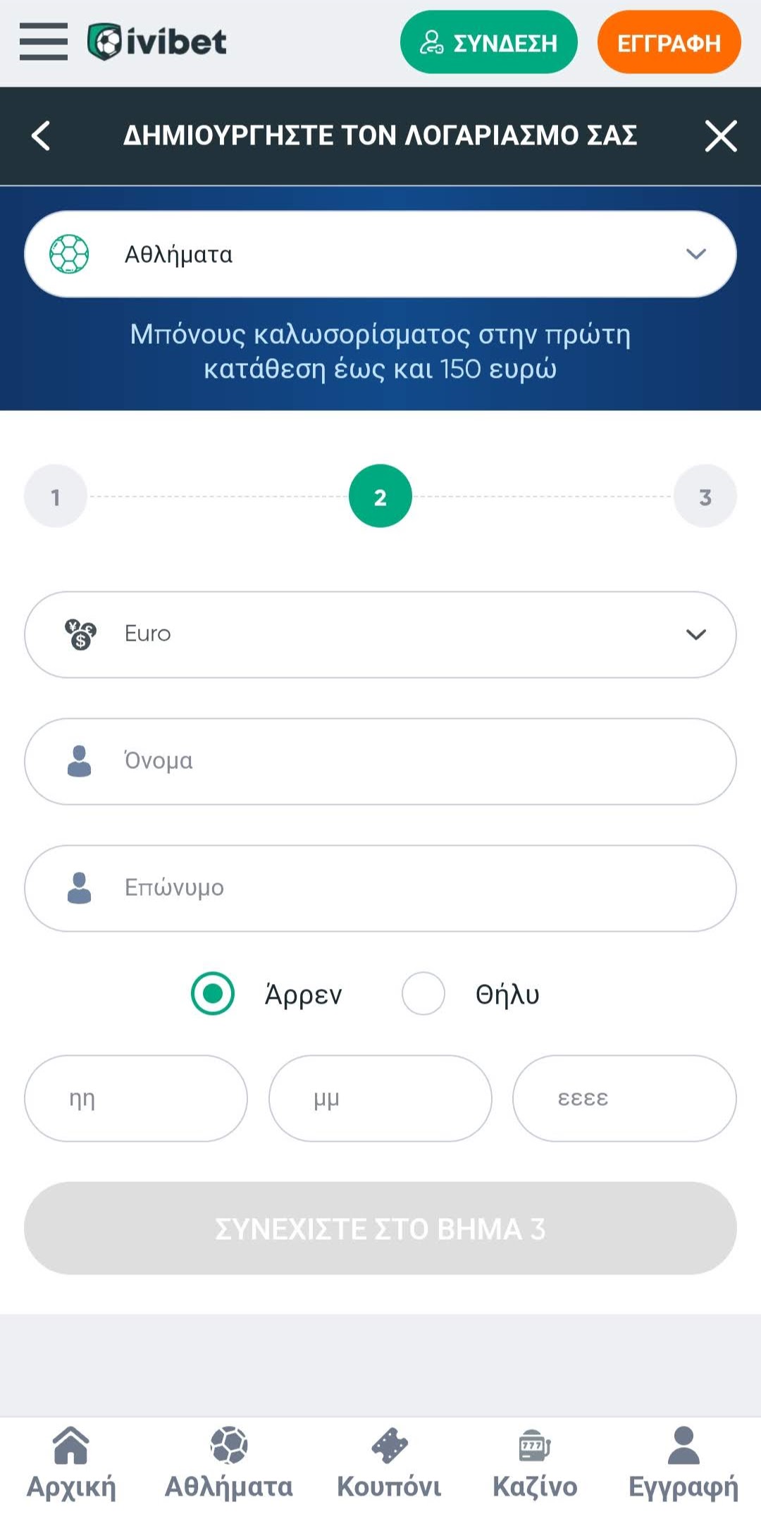 2ο βήμα: Επιλέγετε το νόμισμα και εισάγετε τα στοιχεία που σας ζητάει – όνομα, επίθετο, φύλο, ημερομηνία και έτος γέννησης