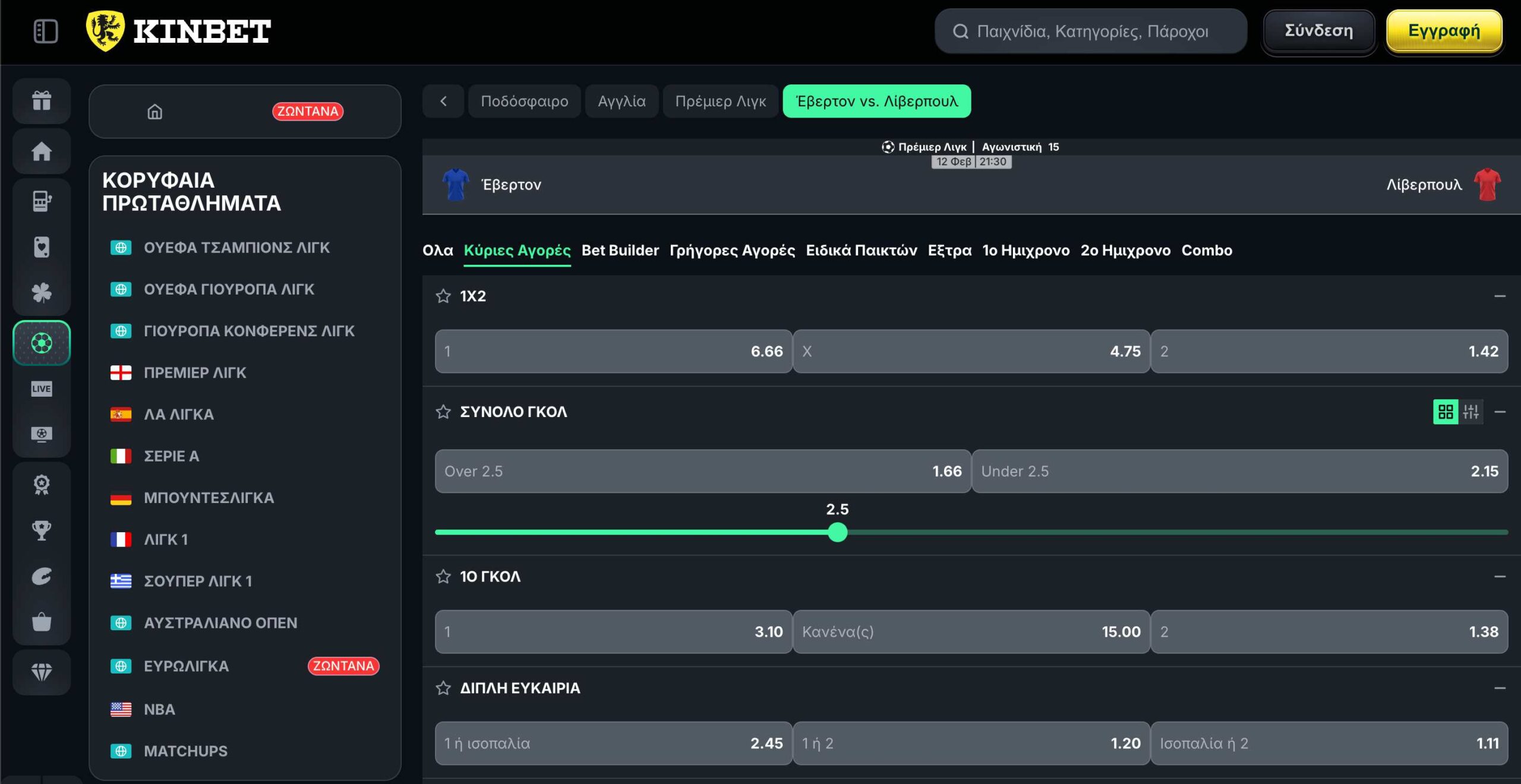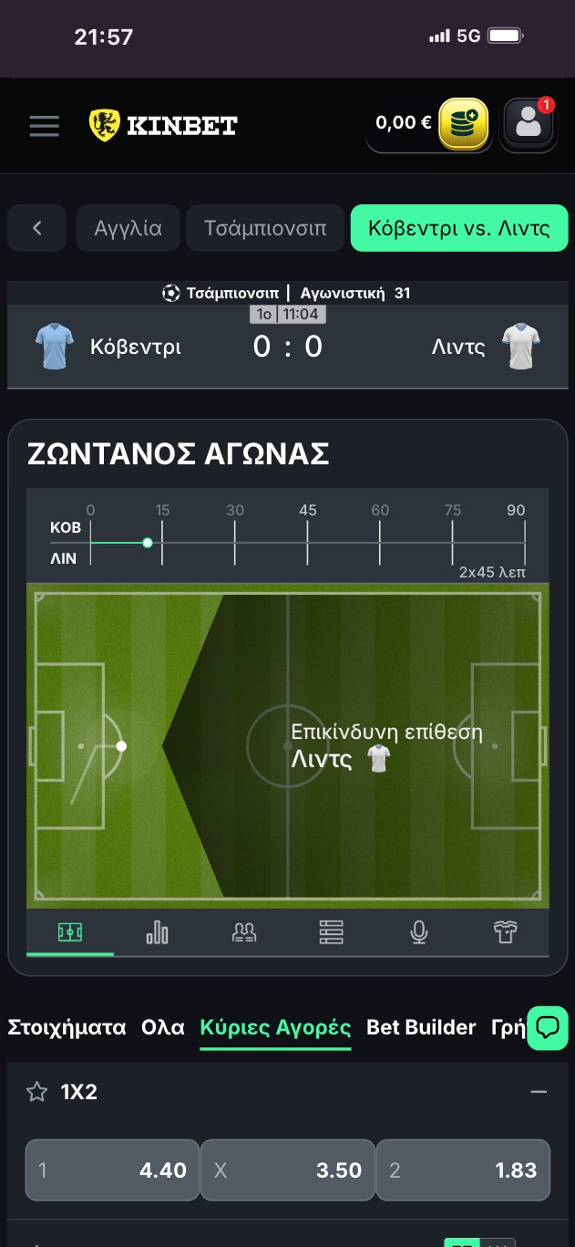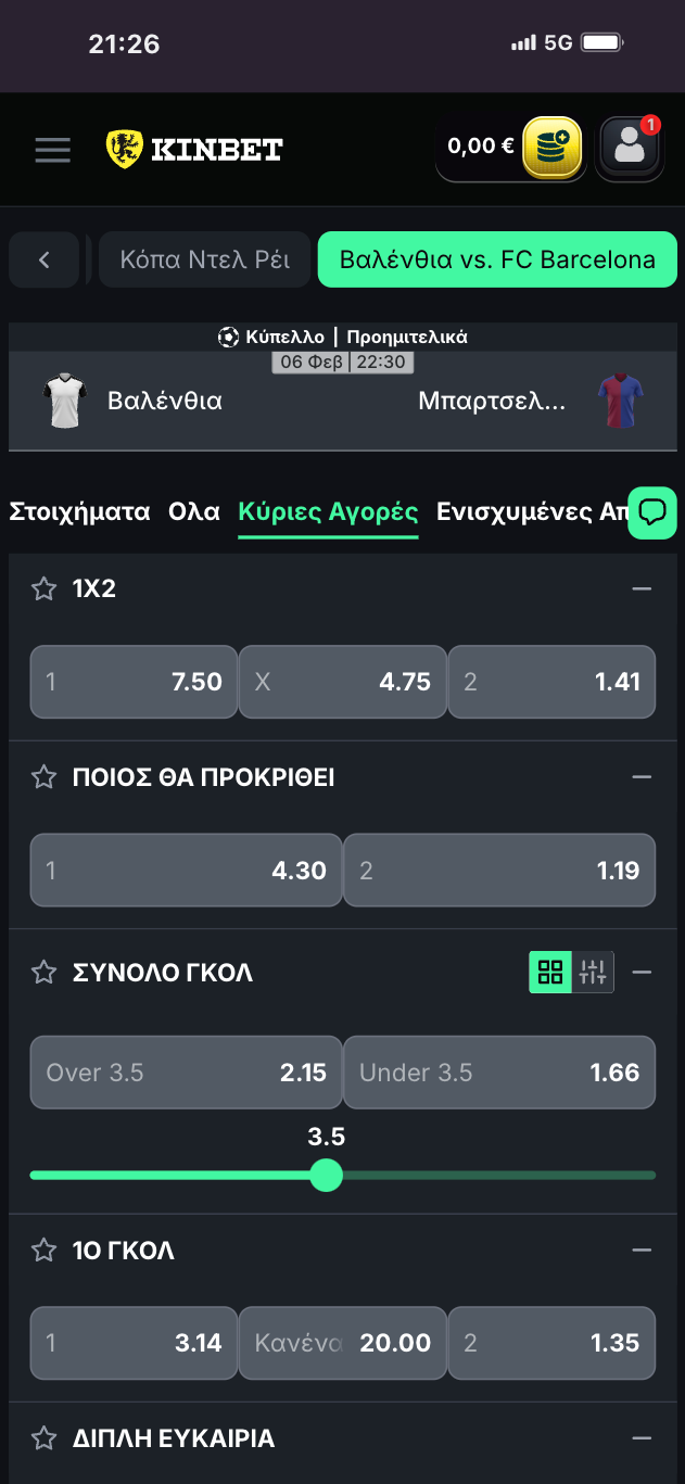 Οι αγορές, τώρα, ακολουθούν την ίδια λογική με τα αθλήματα στην περίπτωση της KinBet. Σε κορυφαία γεγονότα των δημοφιλέστερων αθλημάτων – όπως UEFA Champions League, UEFA Europa League, UEFA Conference League, Πρέμιερ Λιγκ, Λα Λιγκα, Λιγκ 1, Μπουντεσλίγκα, Σεριε Α, Ευρωλίγκα, NBA, Grand Slams – η στοιχηματική προσφέρει μεγάλο εύρος αγορών και έτσι έχετε πάρα πολλές επιλογές για ποντάρισμα. Σε έναν αγώνα Πρέμιερ Λιγκ για παράδειγμα, θα βρείτε αμέτρητες αγορές που περιλαμβάνουν: ακριβές σκορ, 1×2, σύνολα (over/under), goal/no goal, διπλή ευκαιρία, draw-no-bet, χάντικαπ, ασιατικά, ημίχρονο/τελικό σκορ, γκολ, πέναλτι, πρώτος σκόρερ, λεπτά (όλα αυτά και στο ημίχρονο/τελικό), πολλά ειδικά παικτών, combo bets. Και προσφέρεται και bet builder για να μπορέσετε να χτίσετε το δικό σας στοίχημα συνδυάζοντας αγορές!