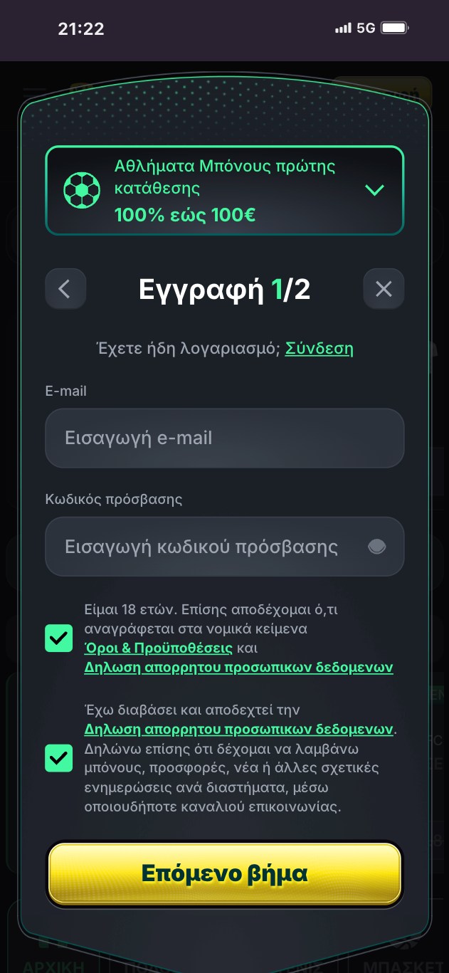Βήμα 2ο: Συμπληρώστε το email σας και ορίστε έναν κωδικό πρόσβασης. Αποδεχτείτε τους Όρους και Προϋποθέσεις χρήσης του σάιτ, επιβεβαιώστε την ηλικία σας και αποδεχτείτε την Πολιτική Απορρήτου. Μετά πατήστε το κουμπί για να προχωρήσετε στο επόμενο βήμα