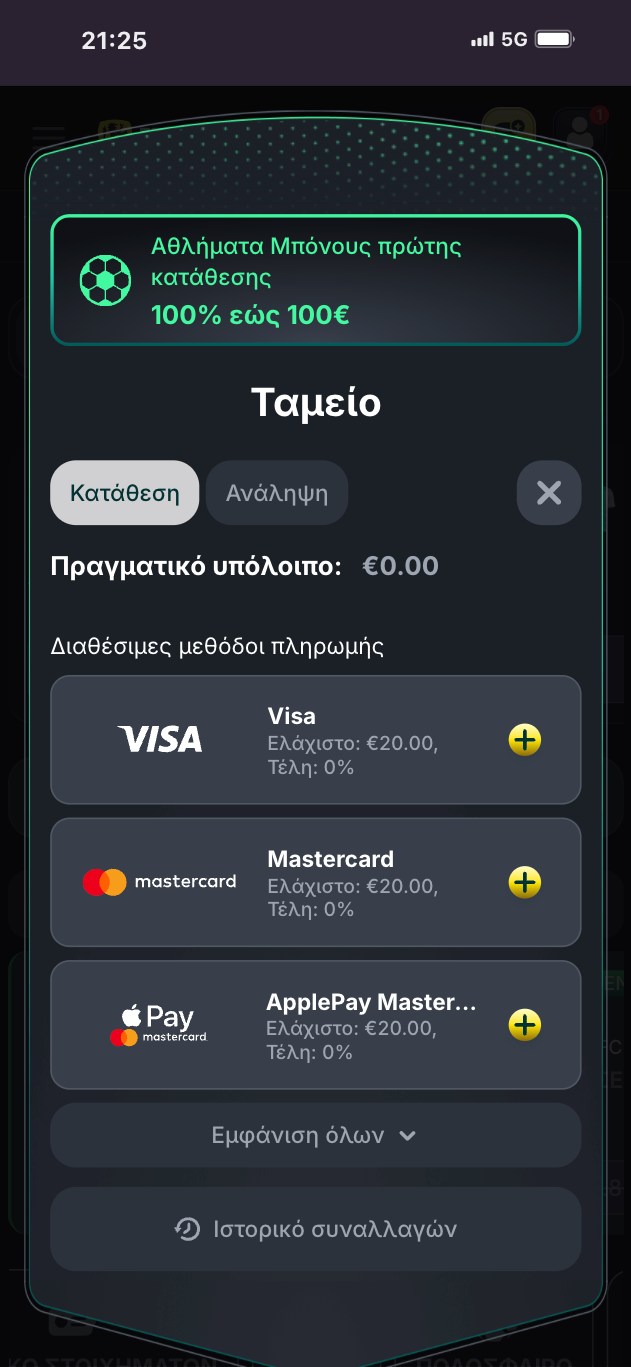 Βήμα 4ο: Στο παράθυρο που ανοίγει μόλις συμπληρώστε όλα τα στοιχεία σας, μπορείτε να πραγματοποιήσετε την πρώτη σας κατάθεση, επιλέγοντας τη μέθοδο και το ποσό και ολοκληρώνοντας τη συναλλαγή. Αυτό το βήμα δεν είναι απαραίτητο για την εγγραφή και μπορεί να γίνει οποιαδήποτε άλλη στιγμή πηγαίνοντας στο κουμπί με τα νομίσματα δίπλα στο εικονίδιο του προφίλ σας.