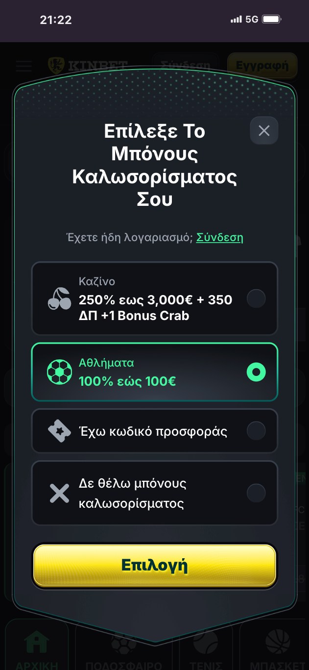 Βήμα 1ο: Επισκεφτείτε το σάιτ της KinBet και πατήστε το κουμπί “Εγγραφή” που θα δείτε πάνω δεξιά στην κεντρική σελίδα. Θα σας ανοίξει ένα παράθυρο στο οποίο θα πρέπει να επιλέξετε το μπόνους καλωσορίσματος. Αν δε θέλετε να πάρετε την προσφορά εγγραφής, απλώς τικάρετε την αντίστοιχη επιλογή. Αν θέλετε να πάρετε το μπόνους, τότε πρέπει να διαλέξετε ανάμεσα στην προσφορά για το αθλητικο στοίχημα και την προσφορά για το καζίνο – η KinBet λειτουργεί και σαν διαδικτυακό καζίνο. Επίσης, αν έχετε promo code μπορείτε να τον εισάγετε σε αυτό το σημείο. Μόλις επιλέξετε, πατήστε το κουμπί για να προχωρήσετε στο επόμενο βήμα