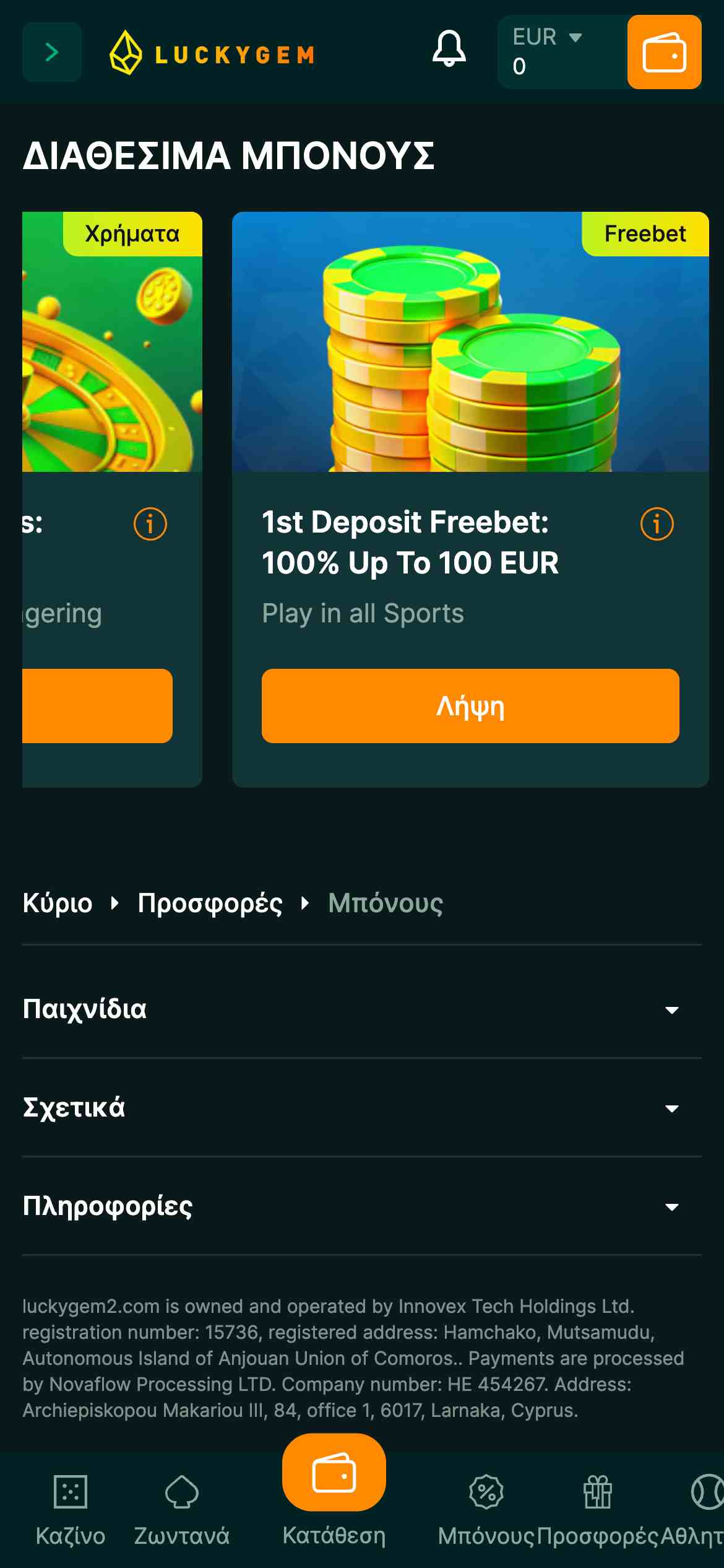 | 💶 Μέθοδοι πληρωμών | Visa, Mastercard, Google Pay, Revolut, Cardano, LuckyGem Cash, Binance, Solana, LuckyGem, Ethereum, Litecoin, Ripple, USDC, Stellar, Polygon |