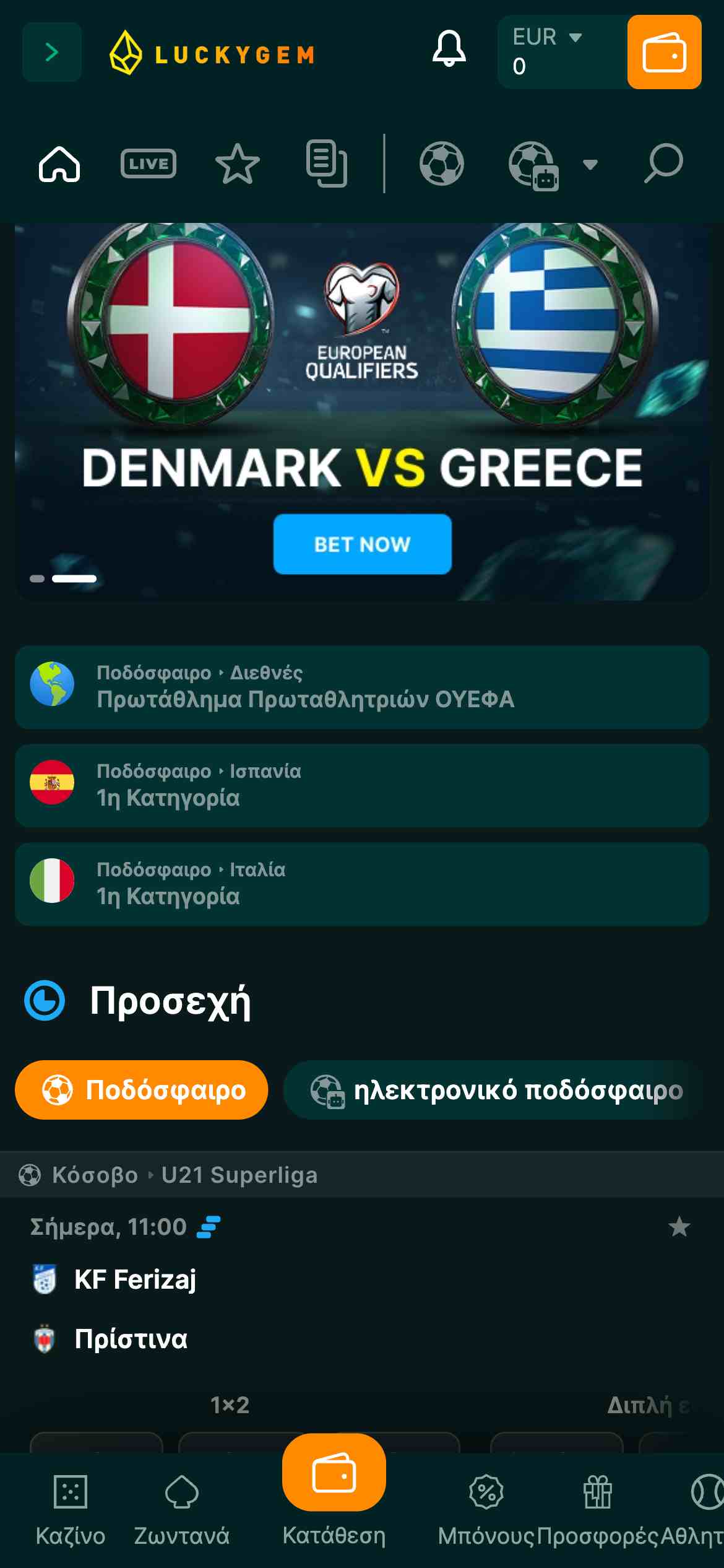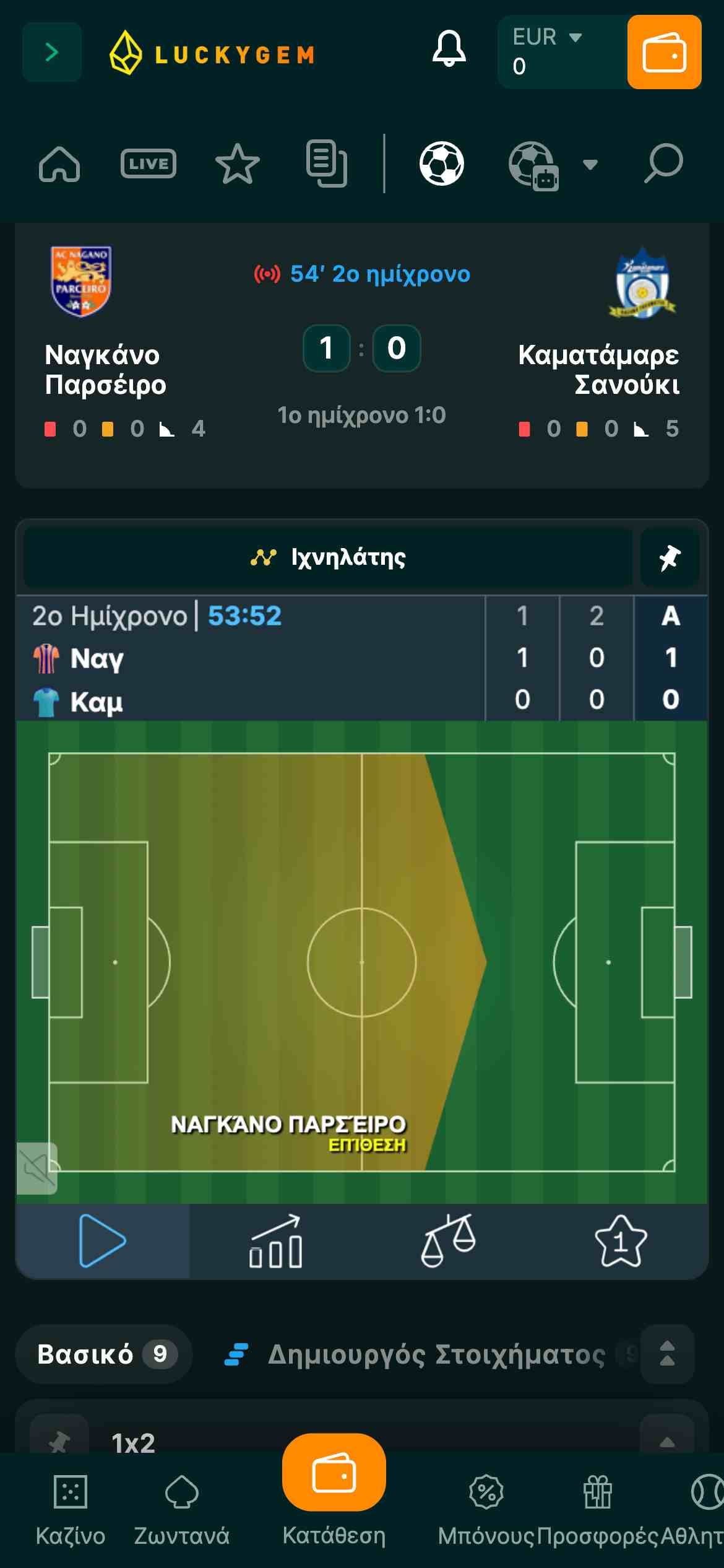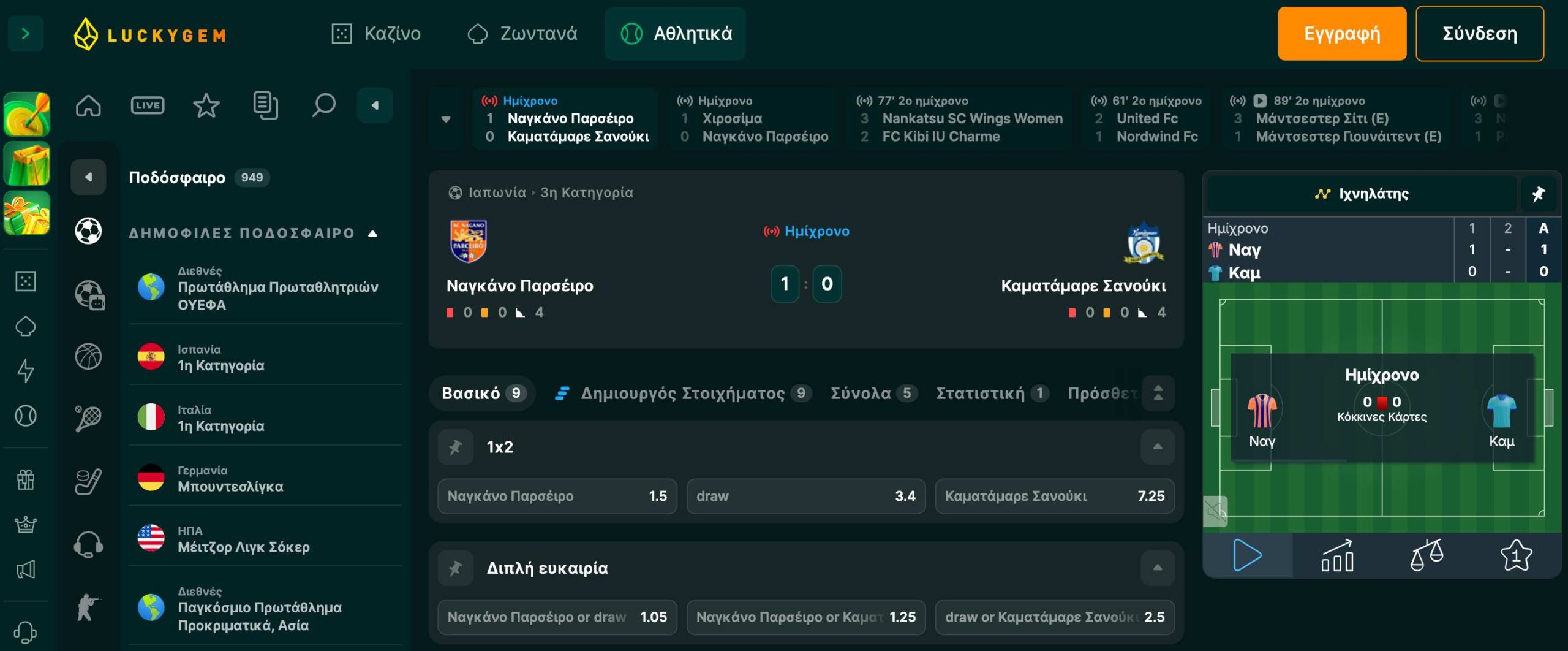 Το αθλητικό στοίχημα στη LuckyGem είναι φυσικά διαθέσιμο και για αναμετρήσεις που βρίσκονται σε εξέλιξη. Μπορείτε να ποντάρετε ζωντανά πατώντας στο κουμπί “live”, ώστε να έχετε πρόσβαση σε όλες τις αναμετρήσεις που βρίσκονται σε εξέλιξη. Στην κεντρική σελίδα μπορείτε να δείτε συγκεντρωμένες μερικές από τις βασικές αγορές για κάθε αγώνα.