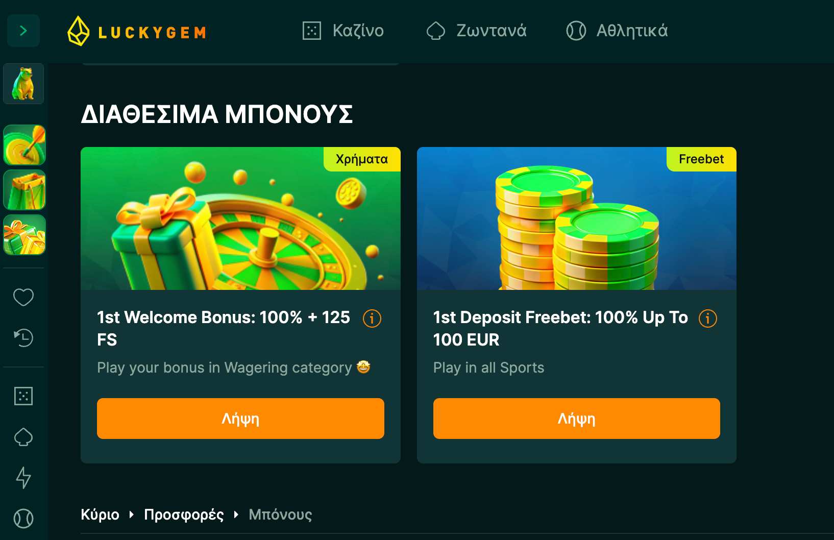 Πρόκειται για την προσφορά πρώτης κατάθεσης, που συνολικά δίνει 100% μπόνους έως 100€ σε free bet και μπορεί να σας δώσει την ώθηση για μία εξαιρετική εκκίνηση στο αθλητικό στοίχημα του LuckyGem.